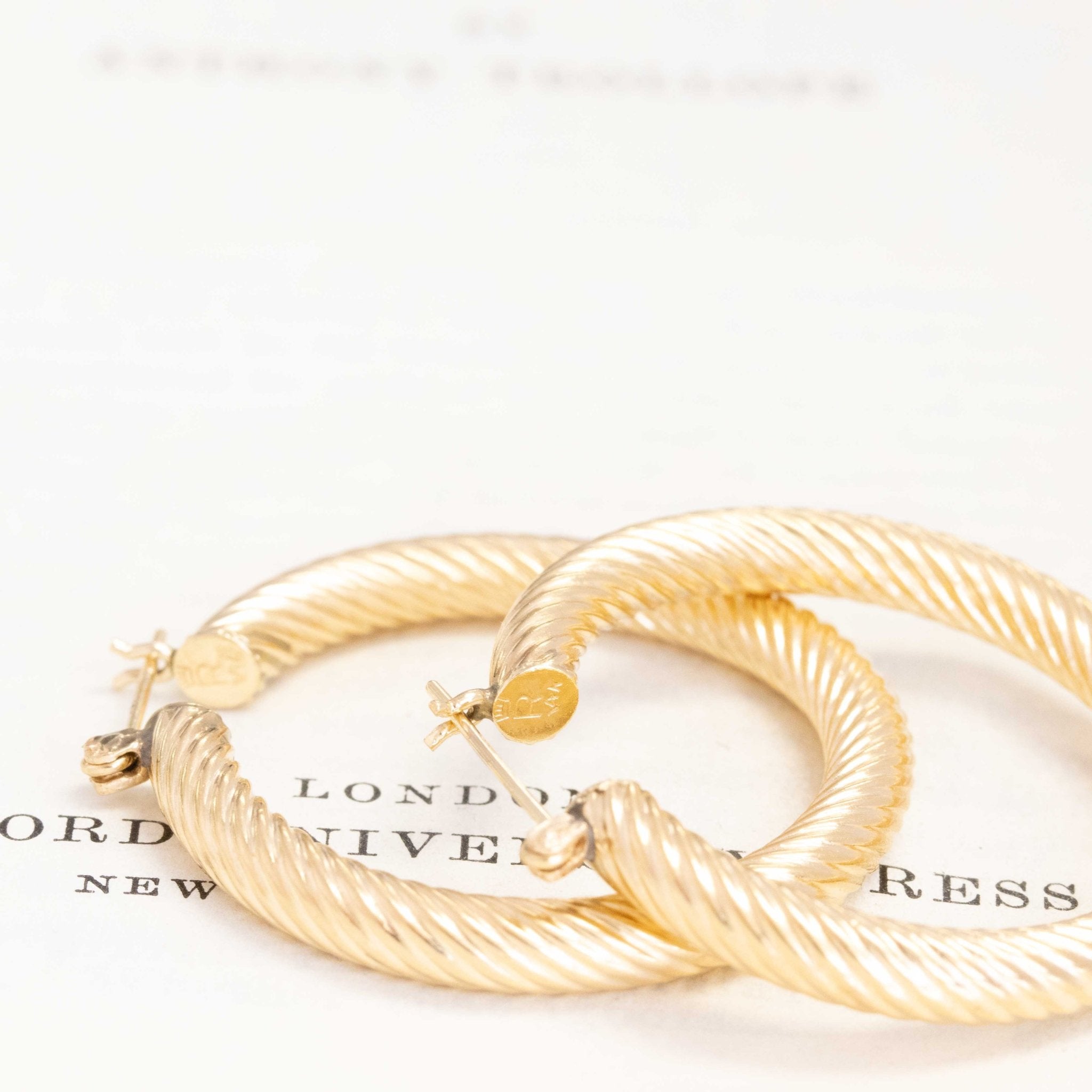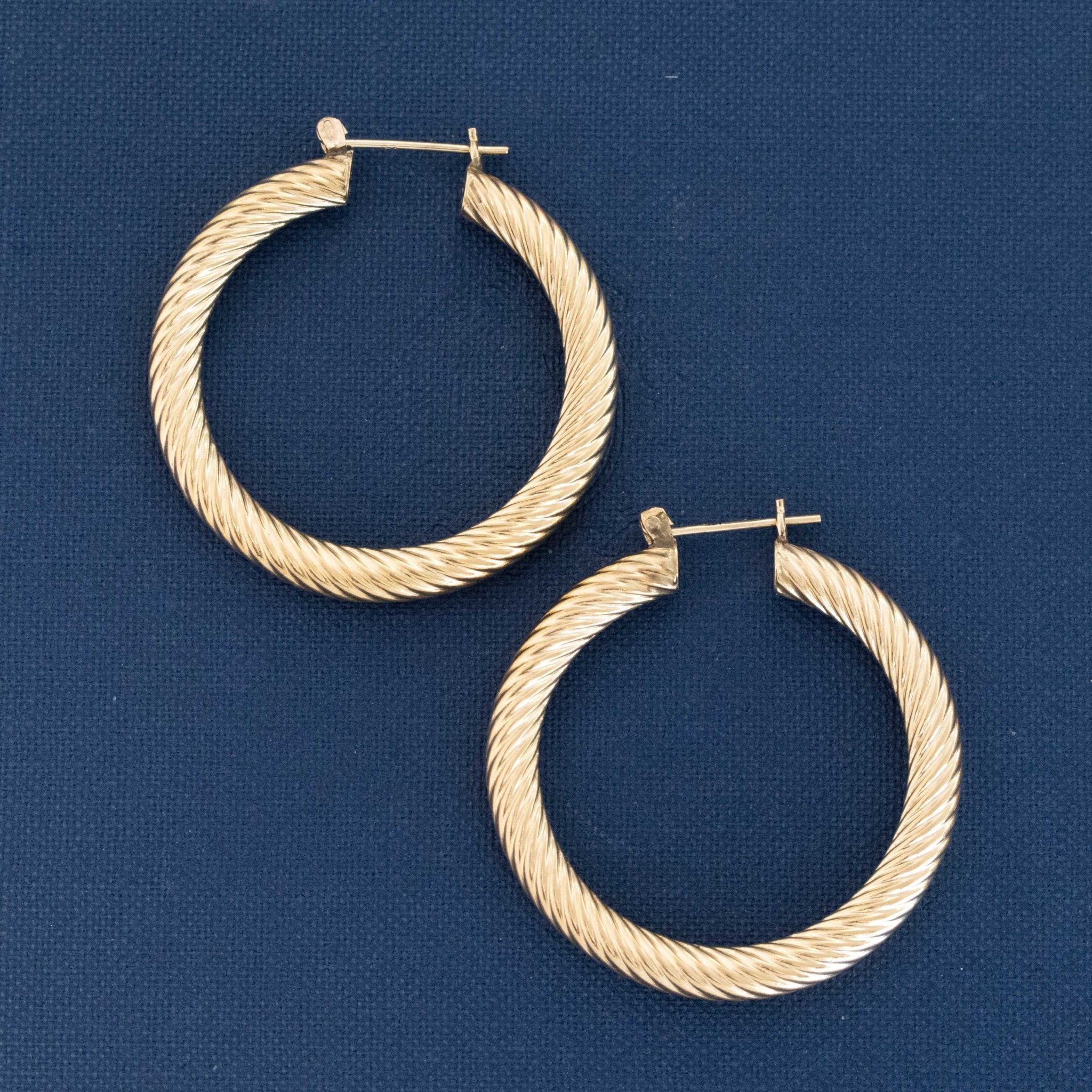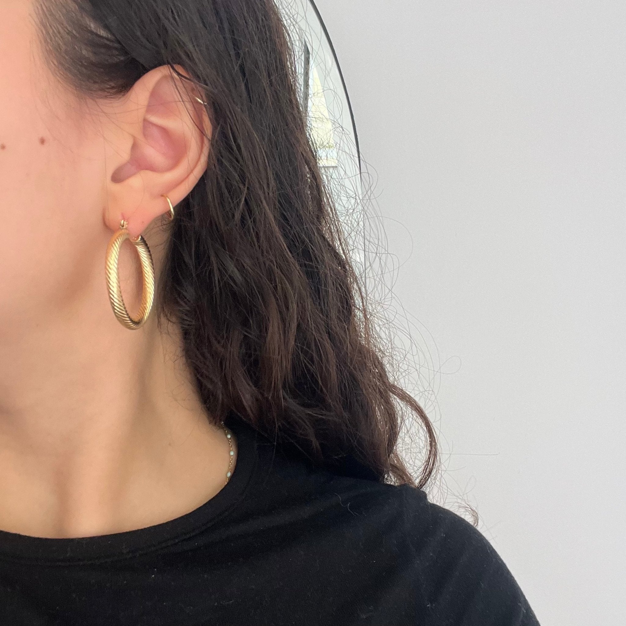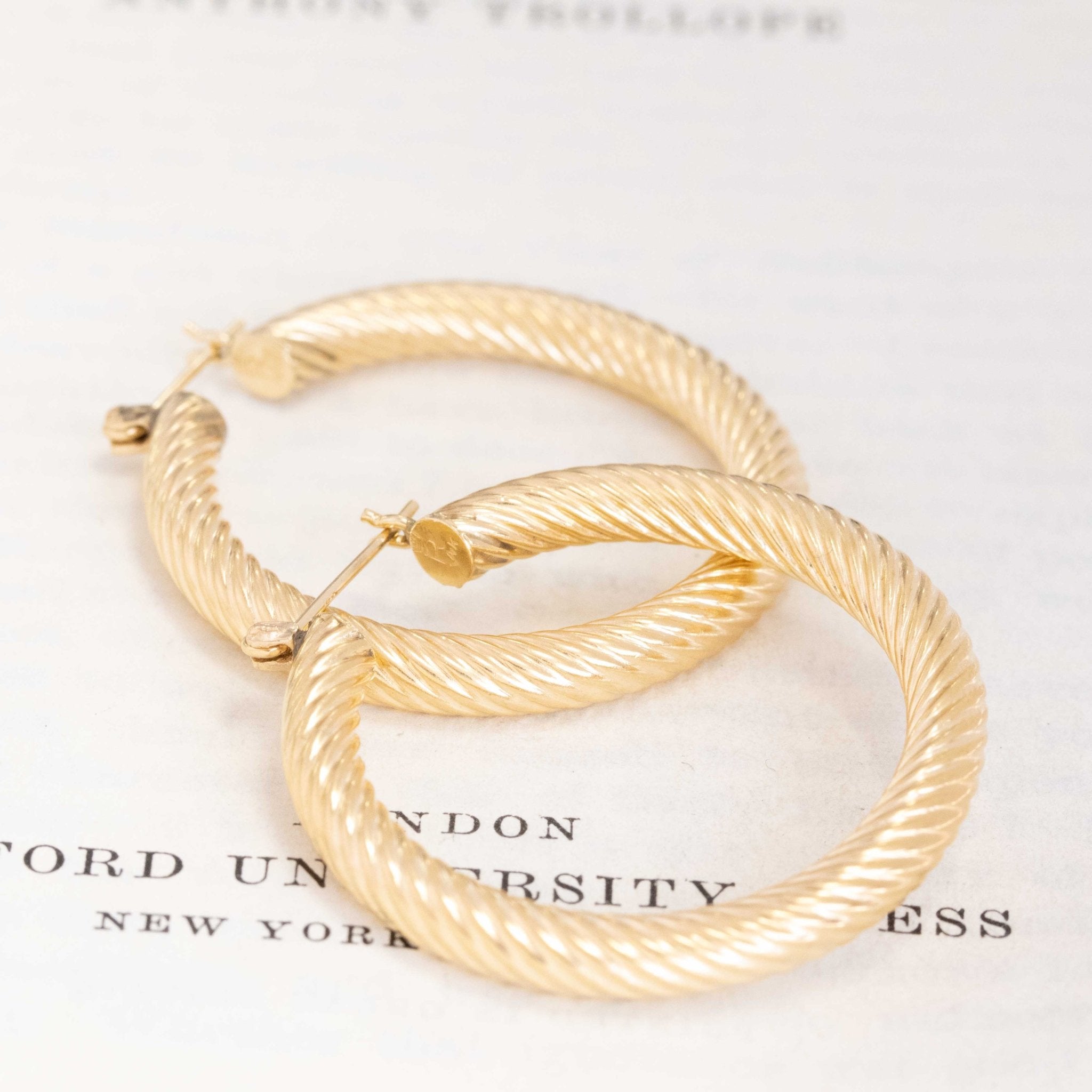 Super sexy large hoop earrings! The twisted rope motif adds an added layer of fun to the overall vibe to boot.