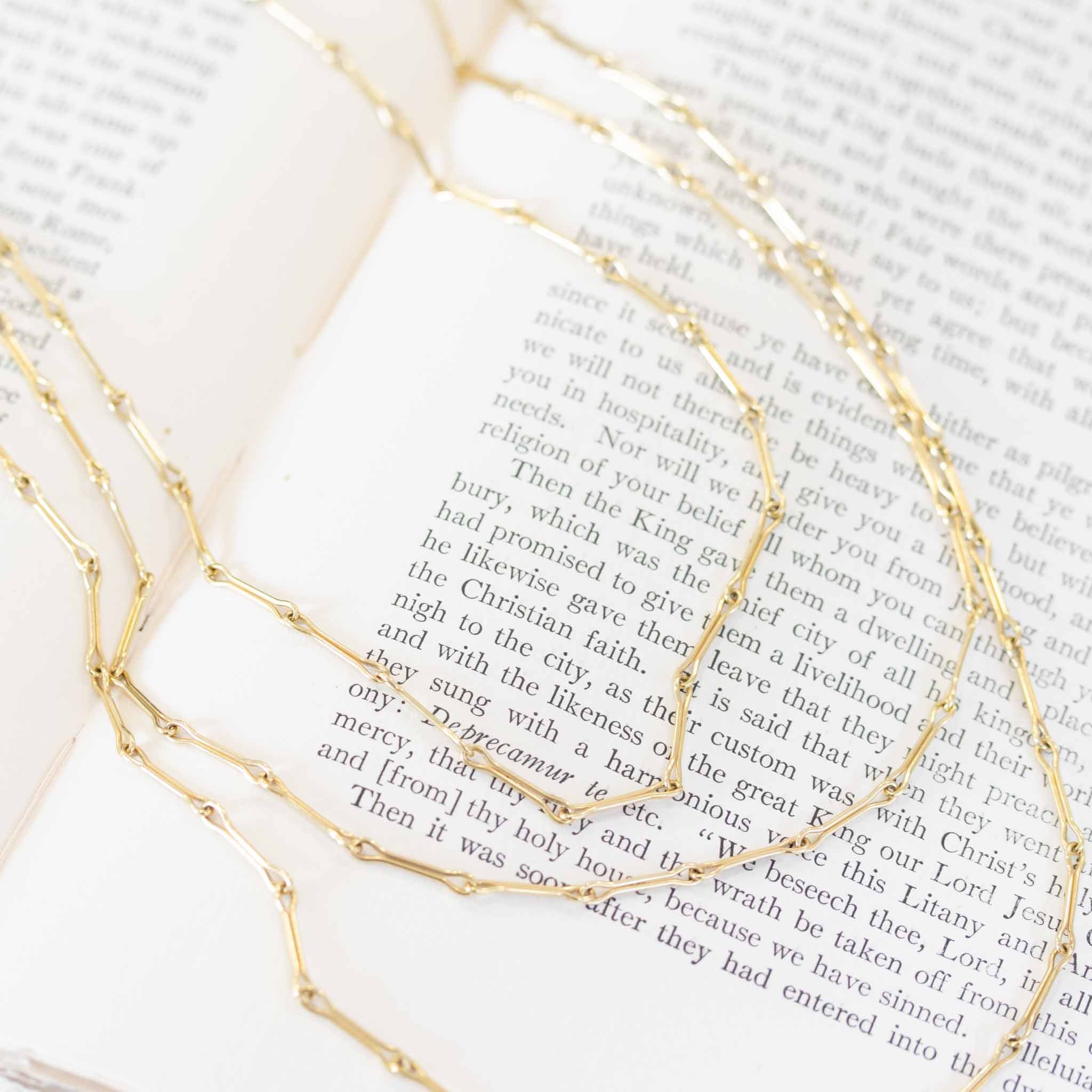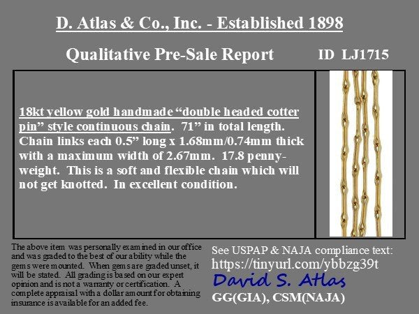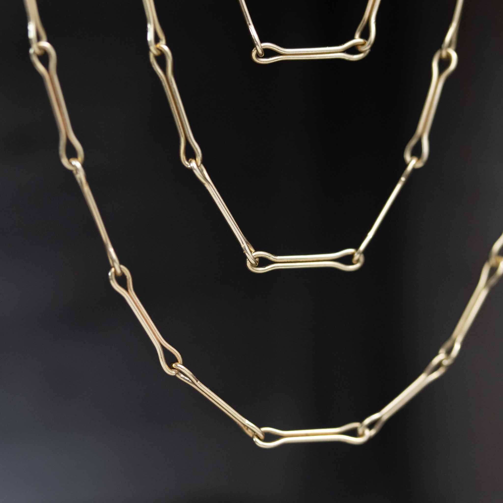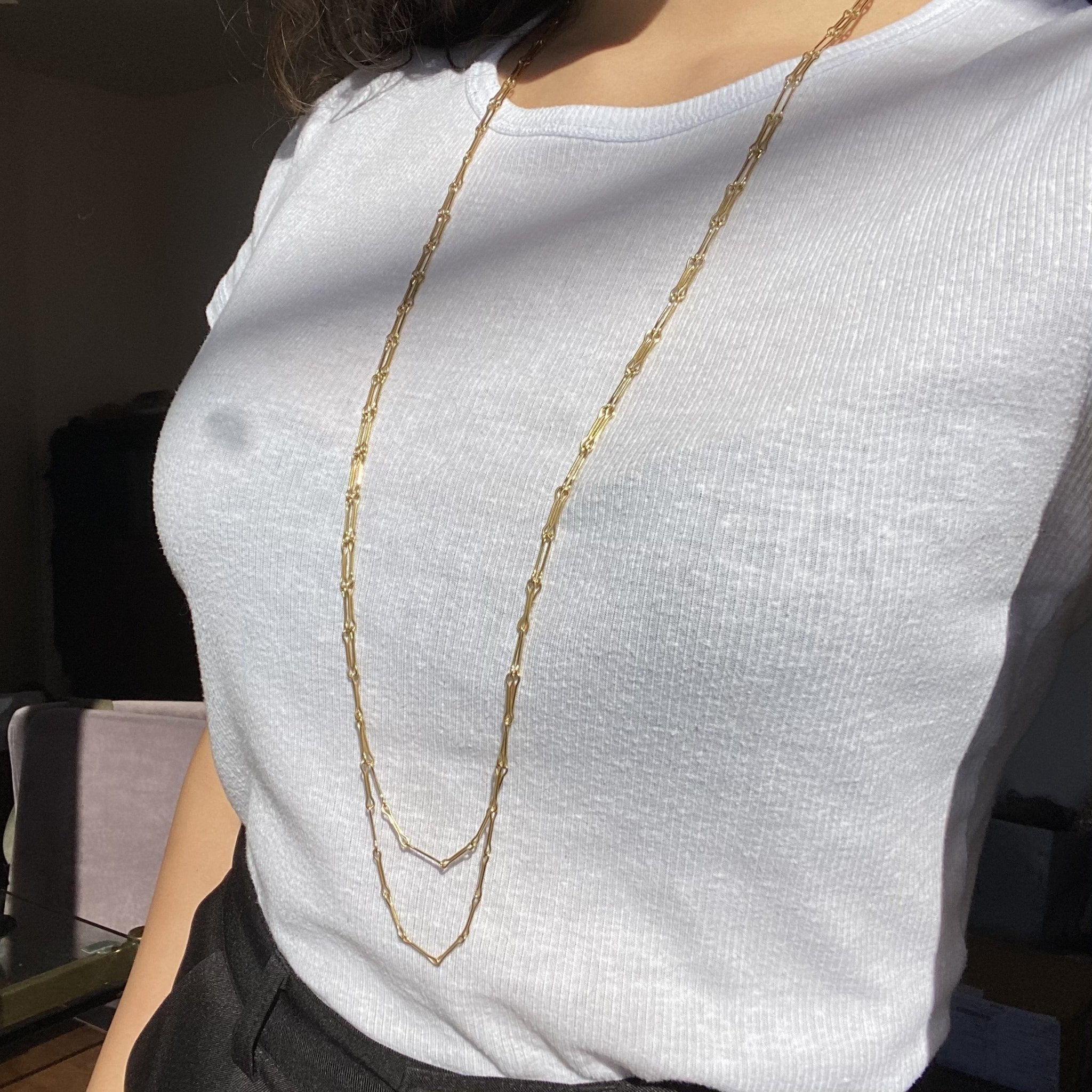One of the prettiest and charming gold chains we have had the pleasure of owning as of late! Lovely and solid stylized links with needle eye ends form a long 71" - perfect to wear rope length, double up, or even tripled up. The links are fine and lay beautifully, in very good condition.
