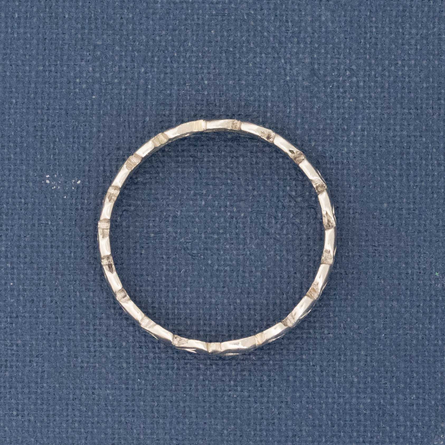 A vintage platinum band which immediately reminded us of a floral garland - sweet little heart-adjacent components span across the finger with engraved details along the inner hearts. The perfect band to add some visual contrast to your current band stacks.