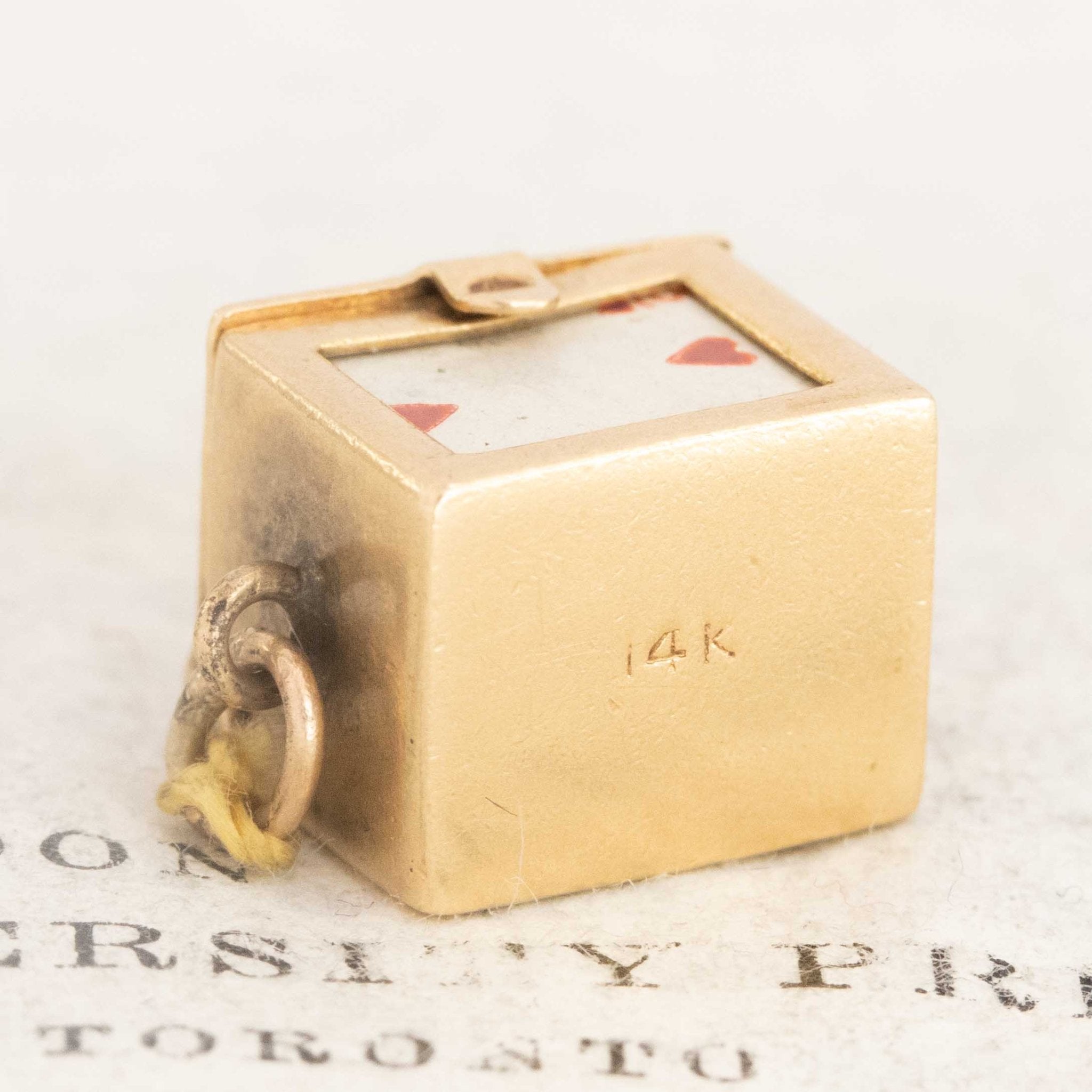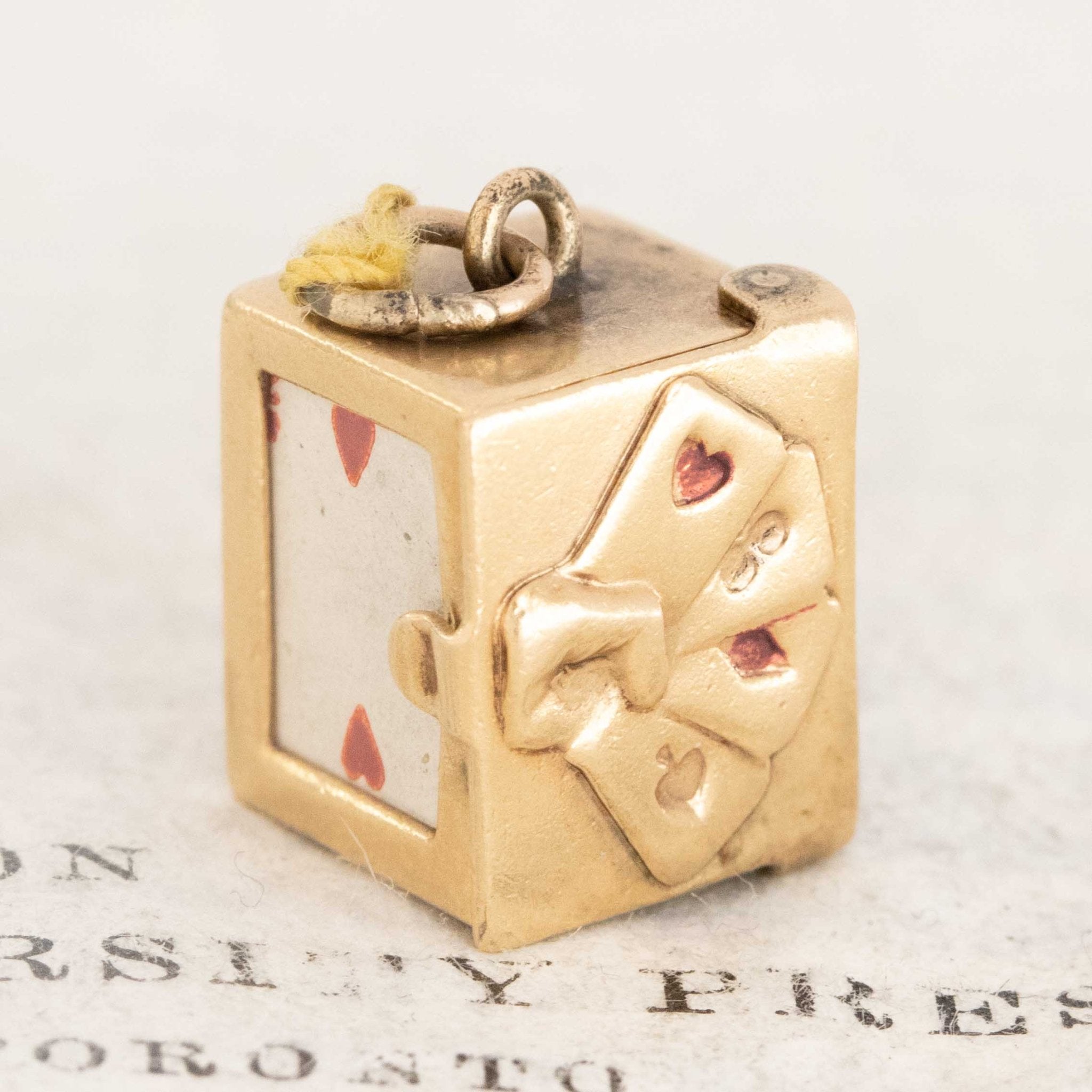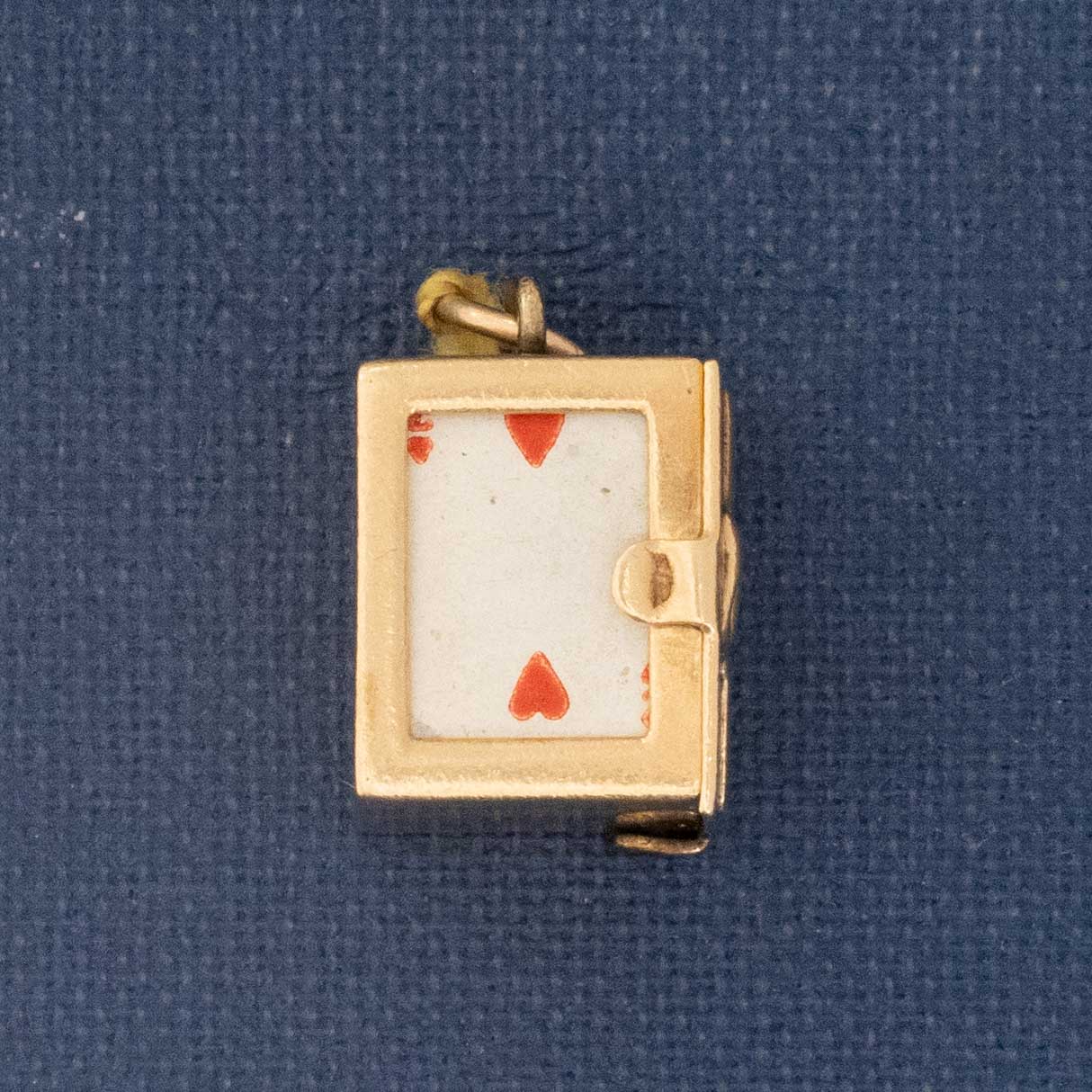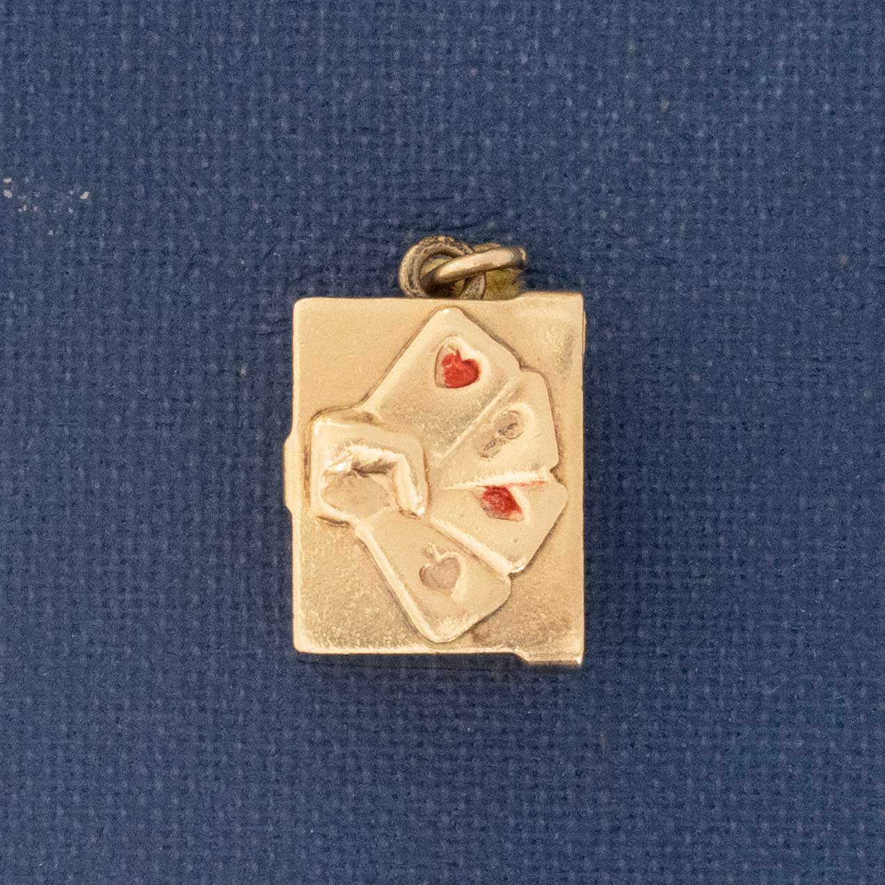 Always a popular charm around these parts - the playing cards! This deck shows the cards inside their original gold case (case opens). Perhaps what you need for some luck!
