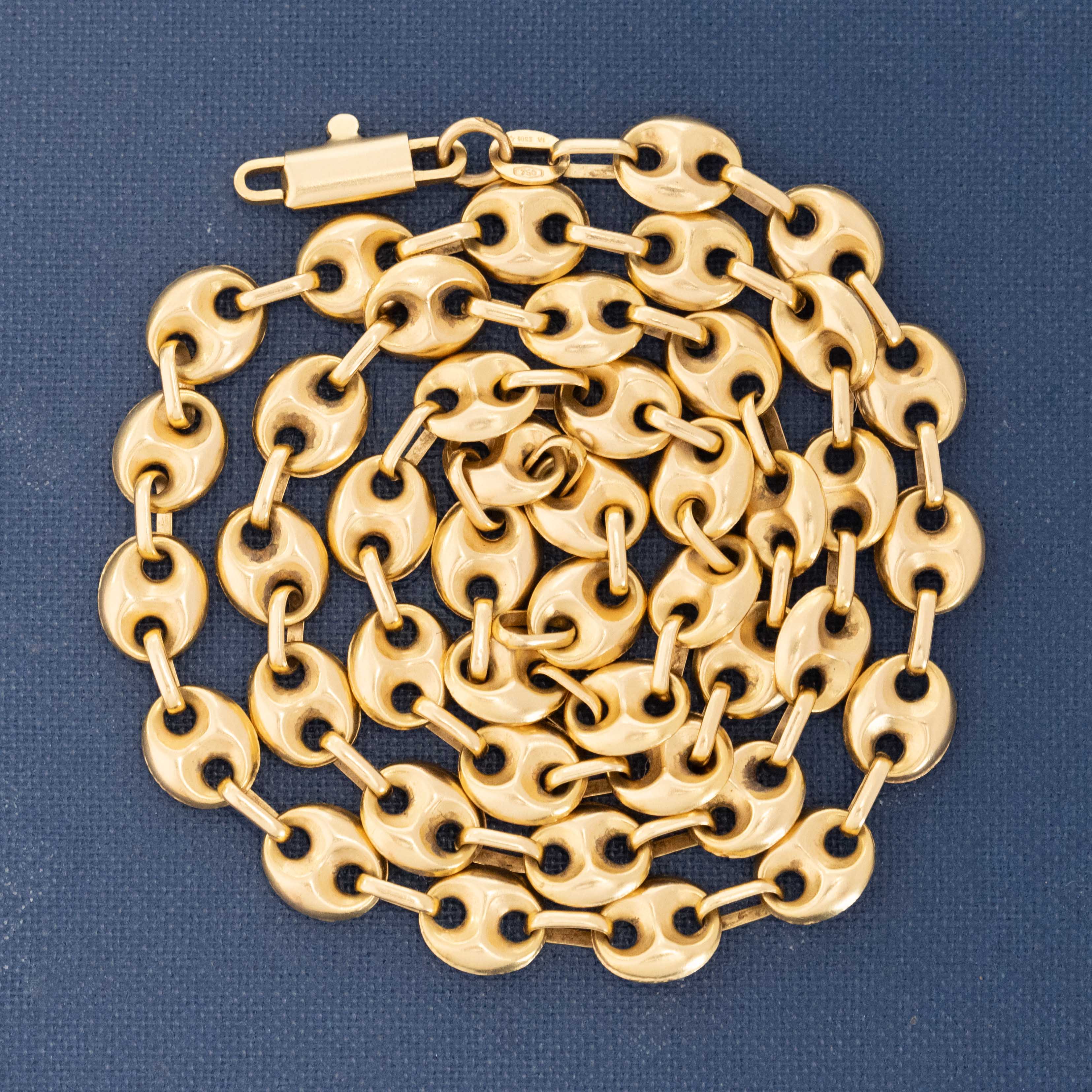 The “puffy” version you see here came later—think late ‘70s through '80s—when Italian goldsmiths started experimenting with rounded, inflated links that caught more light and gave the chain that soft, luxurious volume collectors now seek for its look, tactile comfort, and touch of retro. There’s something inherently nostalgic about it: part nautical heritage, part golden-age glam.