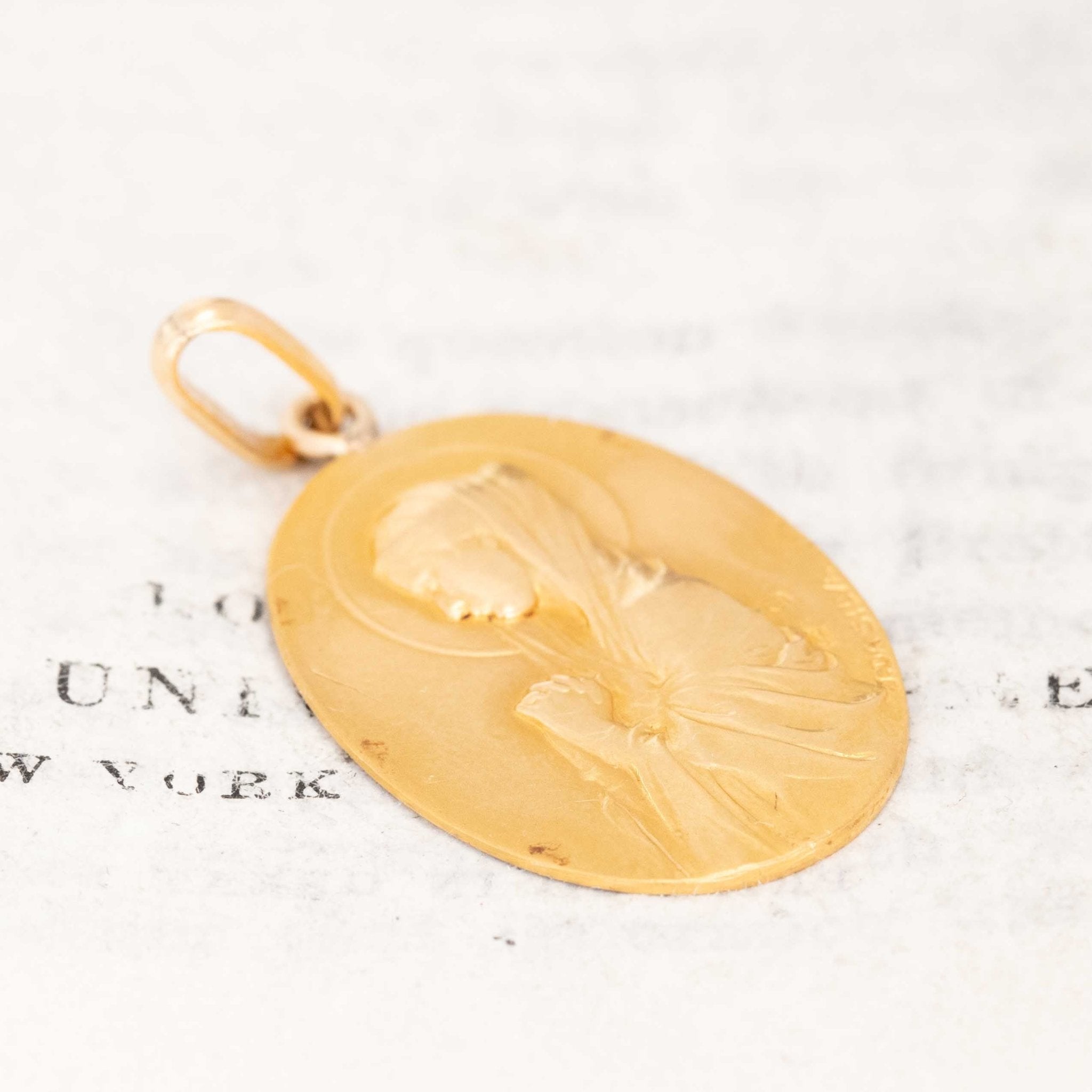 This vintage Virgin Mary charm has such a calming presence. Crafted in warm yellow gold, it features a beautifully soft profile of the Madonna in prayer — that classic, graceful imagery you see in older European devotional medals. The engraving has this gentle, almost luminous quality that only vintage gold seems to pull off.