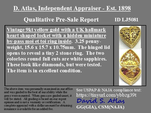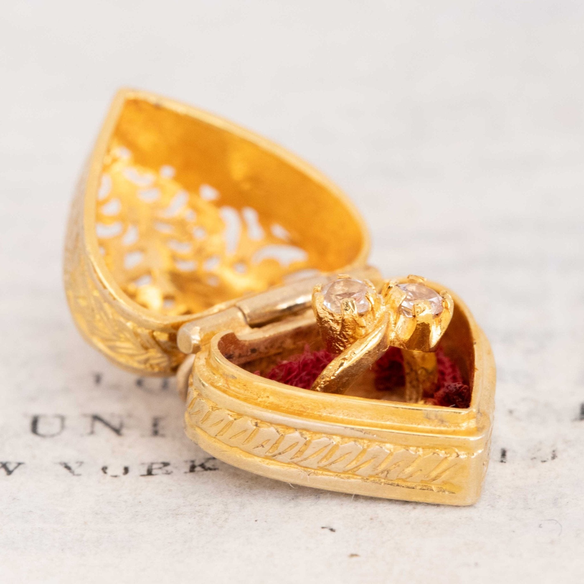 An antique little engagement ring box charm - with delightful metalwork and a fully functioning hinge mechanism that opens the heart up like a ring box, fit with a bypass ring in the middle! English hallmarks and the slightest bit of cloth inside of the ring box, which likely used to line the entire thing.
