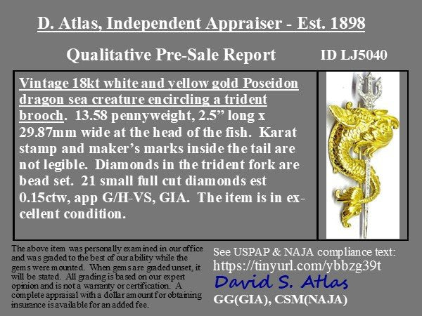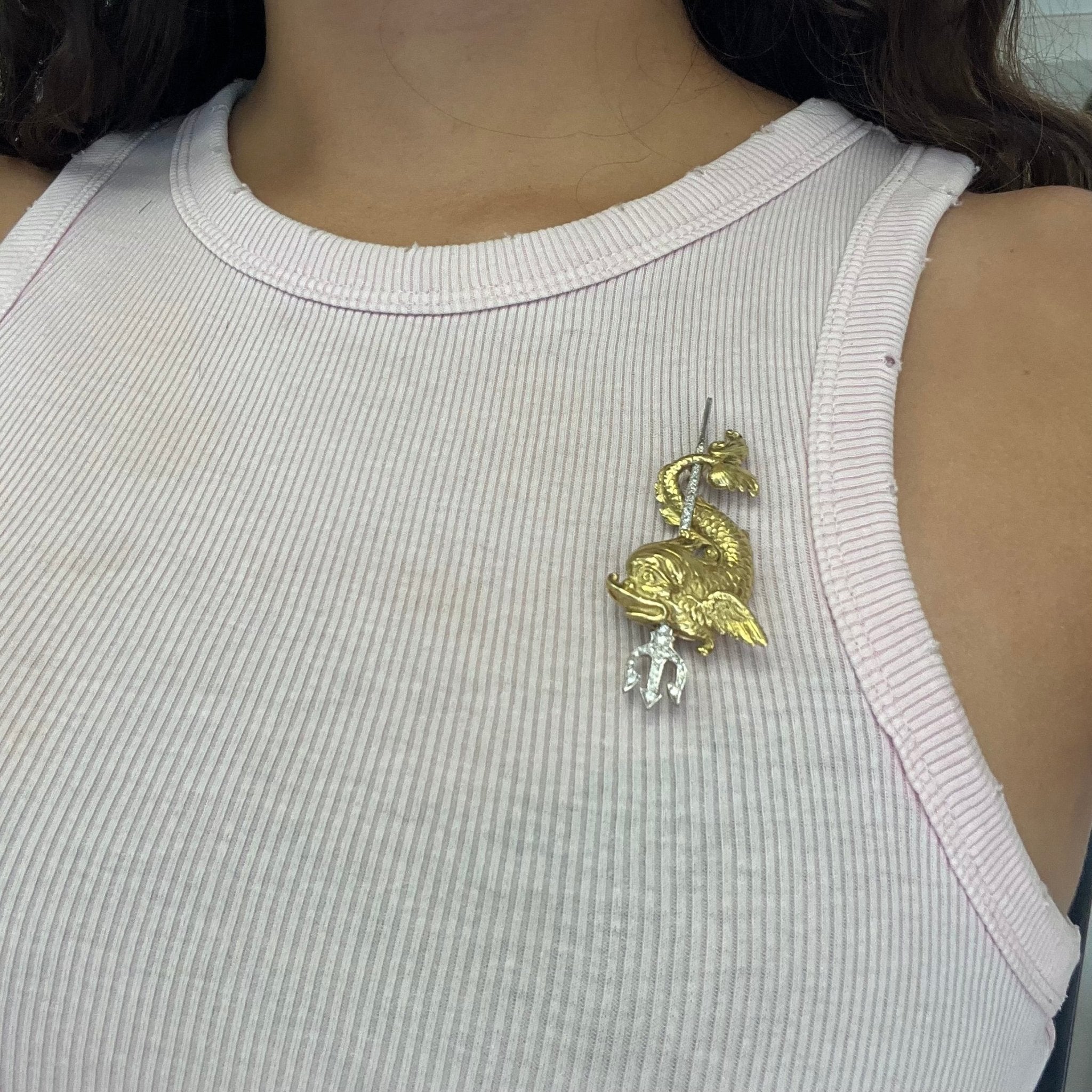 A little myth, a little mischief — and a whole lot of character! This vintage gold sea dragon brooch wraps itself around a diamond-set trident, straight out of Poseidon’s playbook.