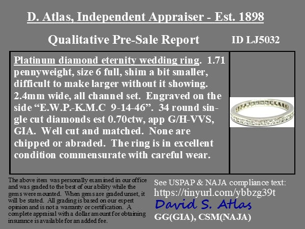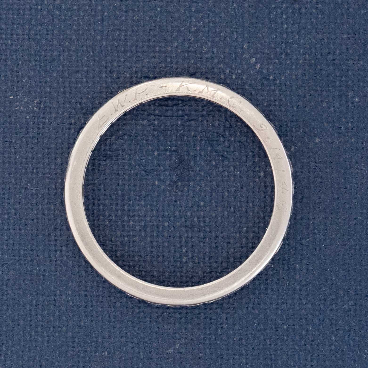 A vintage single cut diamond eternity band, delicate in scale but with plenty of sparkle to go around! The diamonds are channel-set, and along the side of one of the channel walls is an original inscription from the 19 40's. A perfect stacker or wedding band to match your vintage engagement ring.