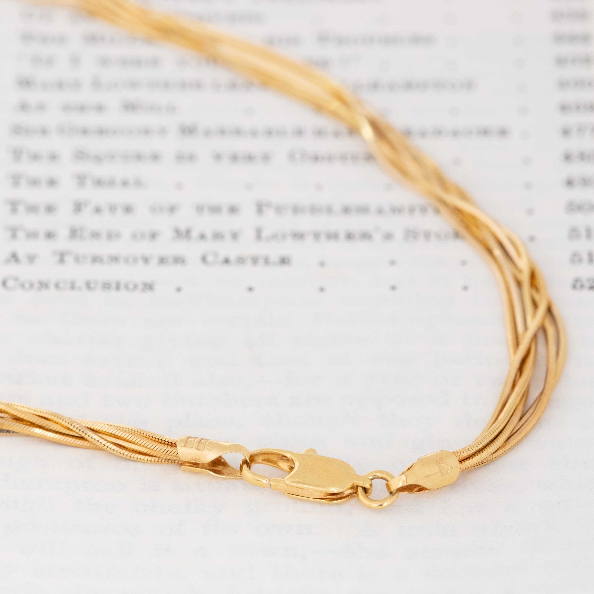A 6-strand snake chain necklace, chic AF and the butteriest piece to hit our desks as of lately! We love how each chain lays with one another, giving the illusion of a stack with the ease of one single clasp. The gold is shimmery and bright, with delicious tone to it.