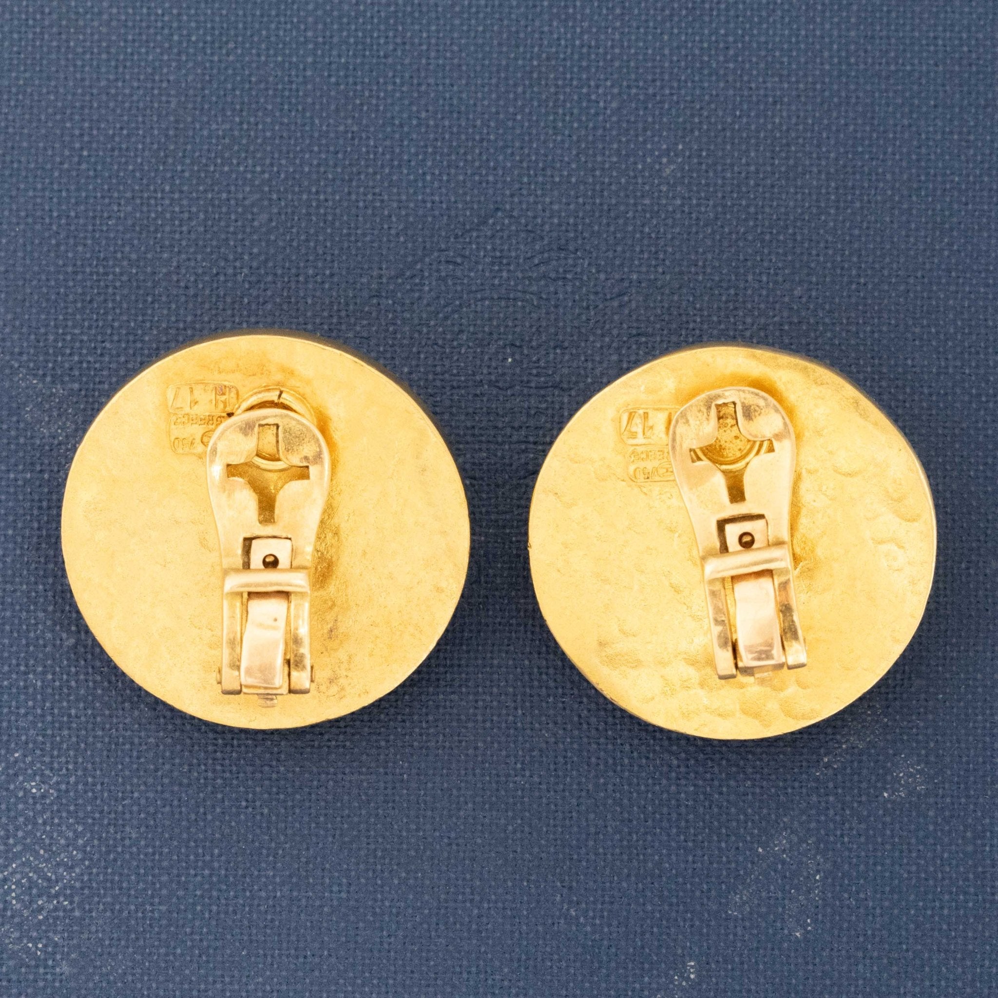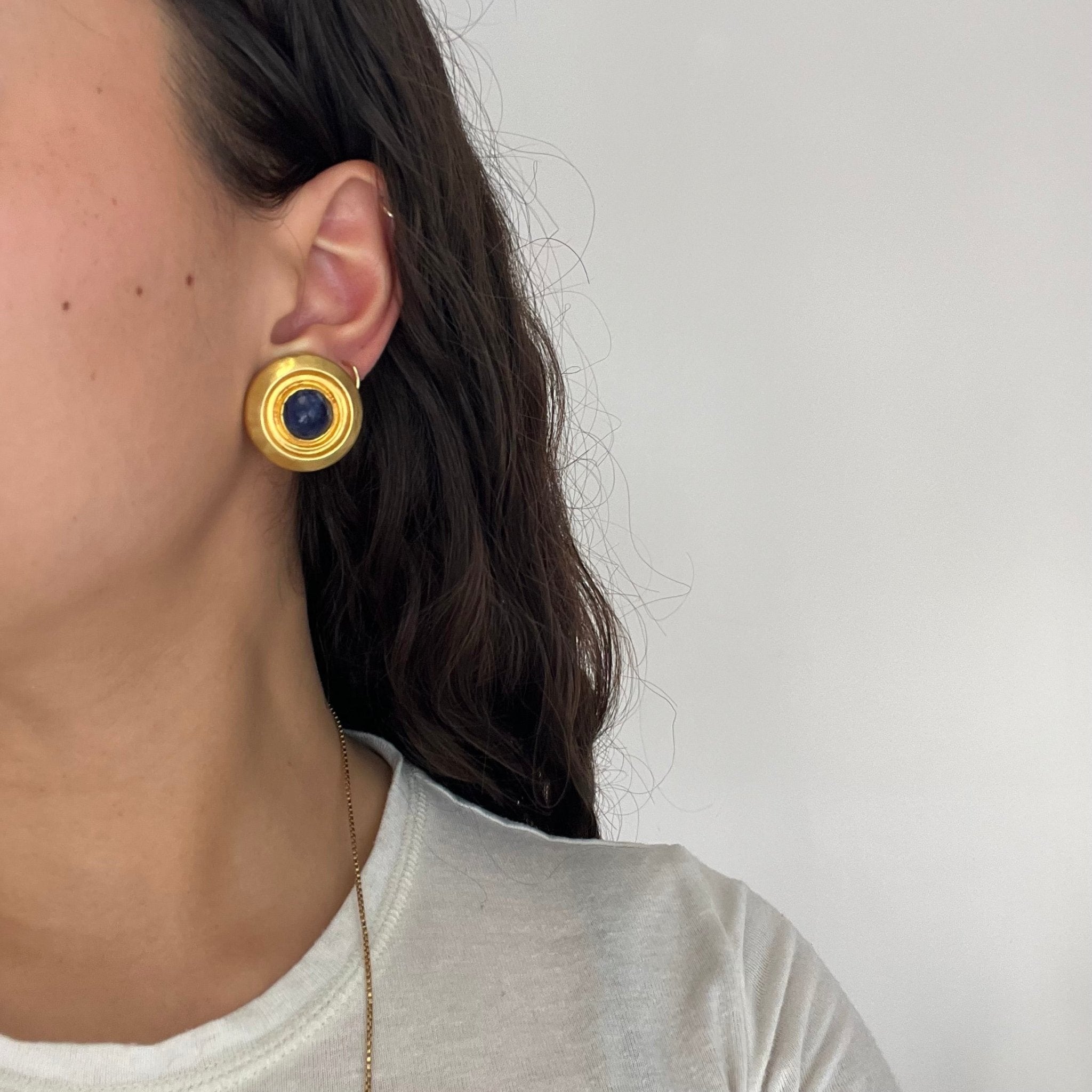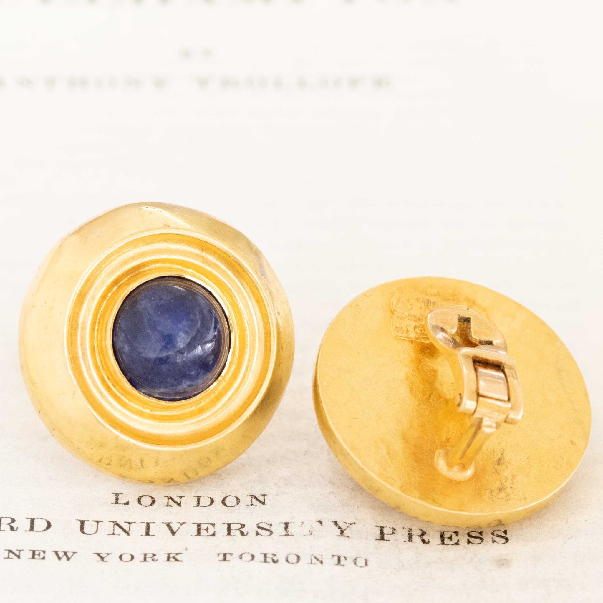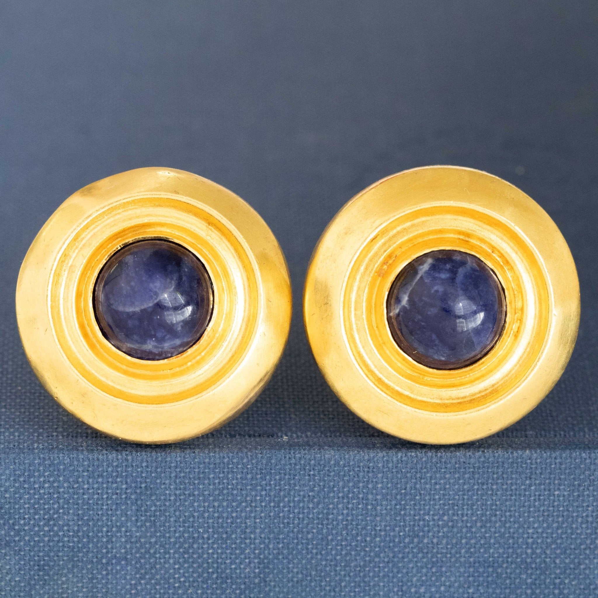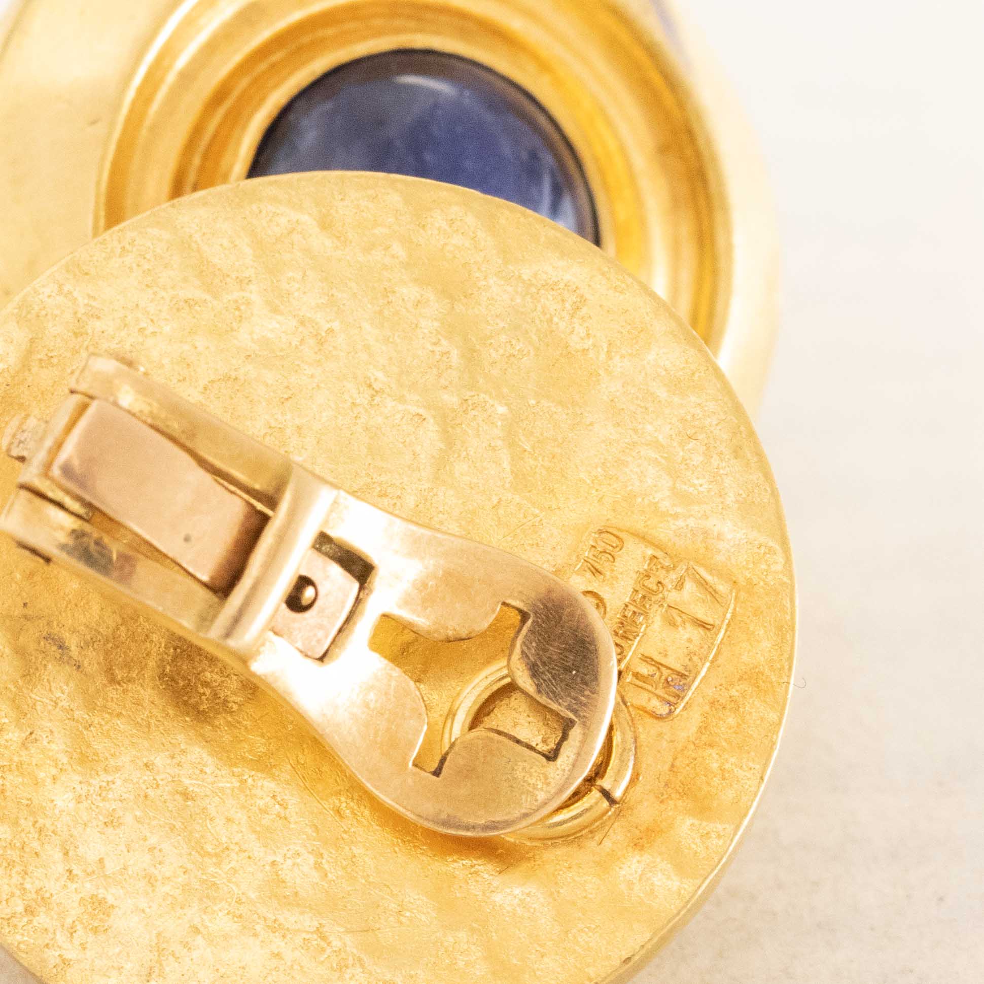 This pair of earrings is classic Lalaounis - with its rich yellow gold setting with a light hammered texture . Beyond chic, and the perfect collector's piece! Bonus: sodalite is said to be the gem to be worn for insight and intuition.