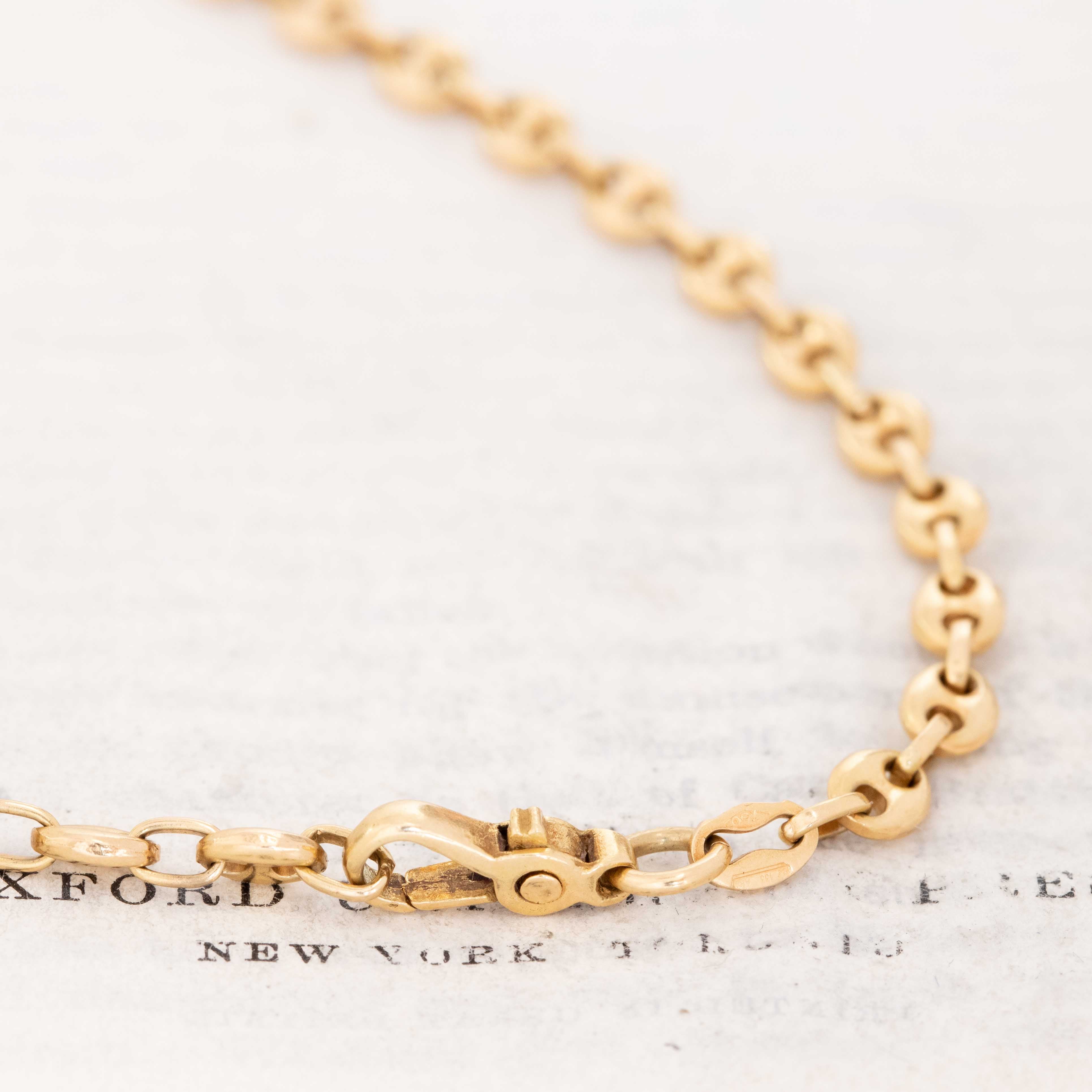 A gloriously chunky and rare vintage puffy mariner link chain with that perfect old-school heft and presence. It feels substantial on the neck, but still sits just right for layering or wearing solo. The mariner link itself has roots in those sturdy anchor chains from ships, and by the mid-century, it became a true jewelry icon when bold, gleaming gold was everywhere.