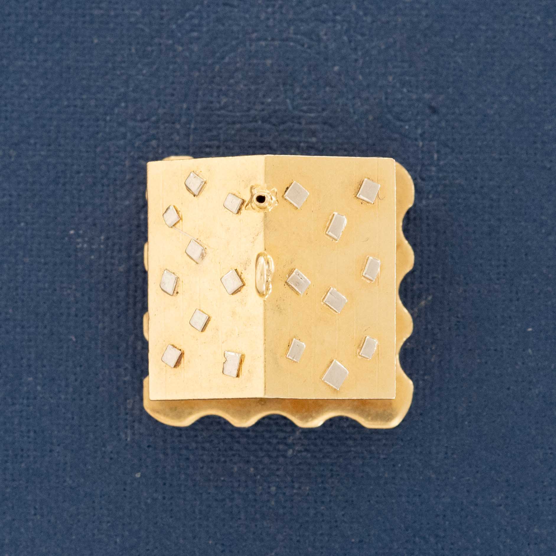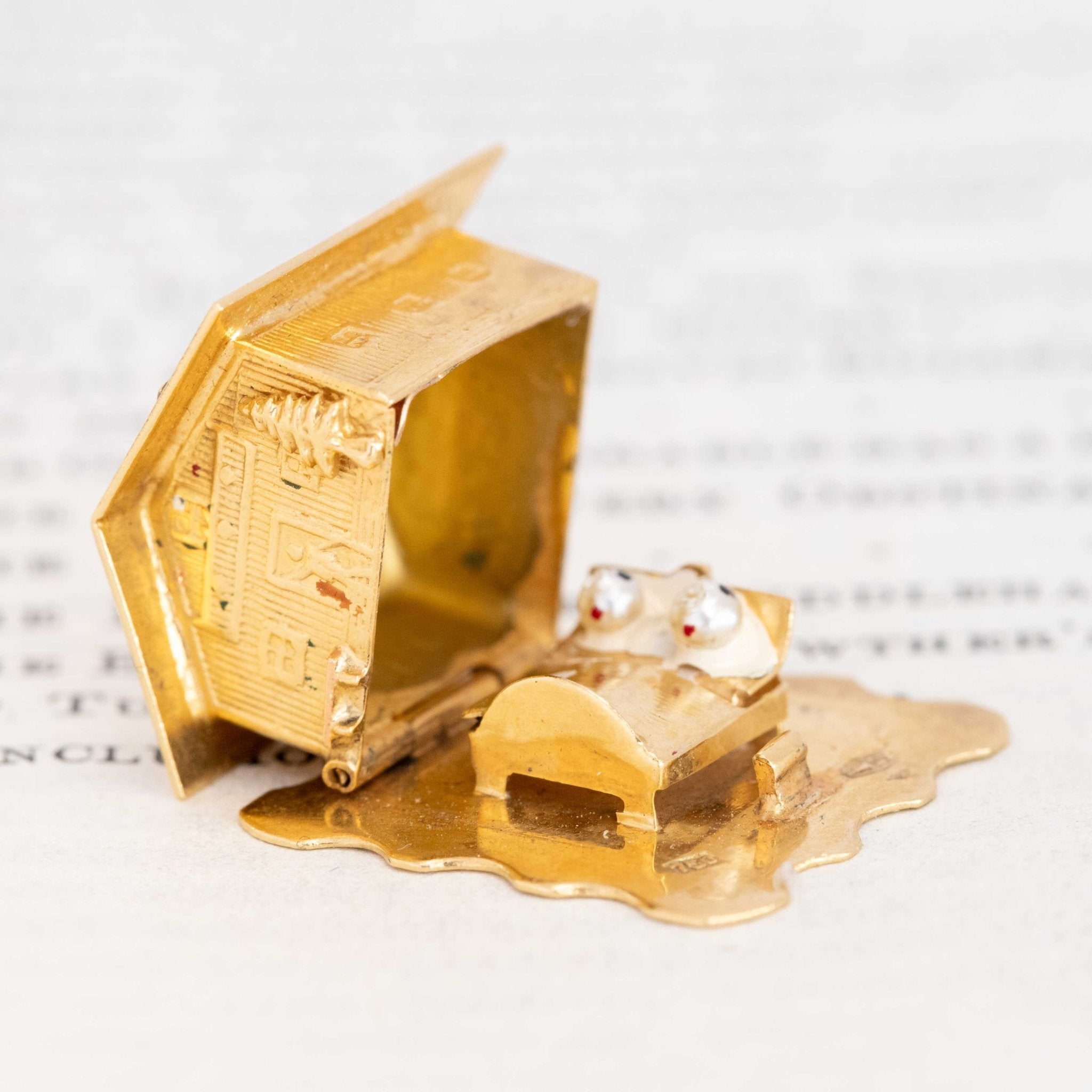 An 18kt Swiss Chalet charm, with such sweetie pie details and a hinged component to reveal a couple sleeping nice and snug in their little bed. It came to us from a 1960’s charm bracelet with a travel theme, so this was likely picked up on a vacation to Switzerland as a souvenir. We love the scale and heft!