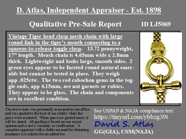 Hand-engraved in gold, the lion’s head has gemstone eyes, with a toggle clasp capped with cabochons (you press the cabs to actually release the lock - such a unique mechanism!).