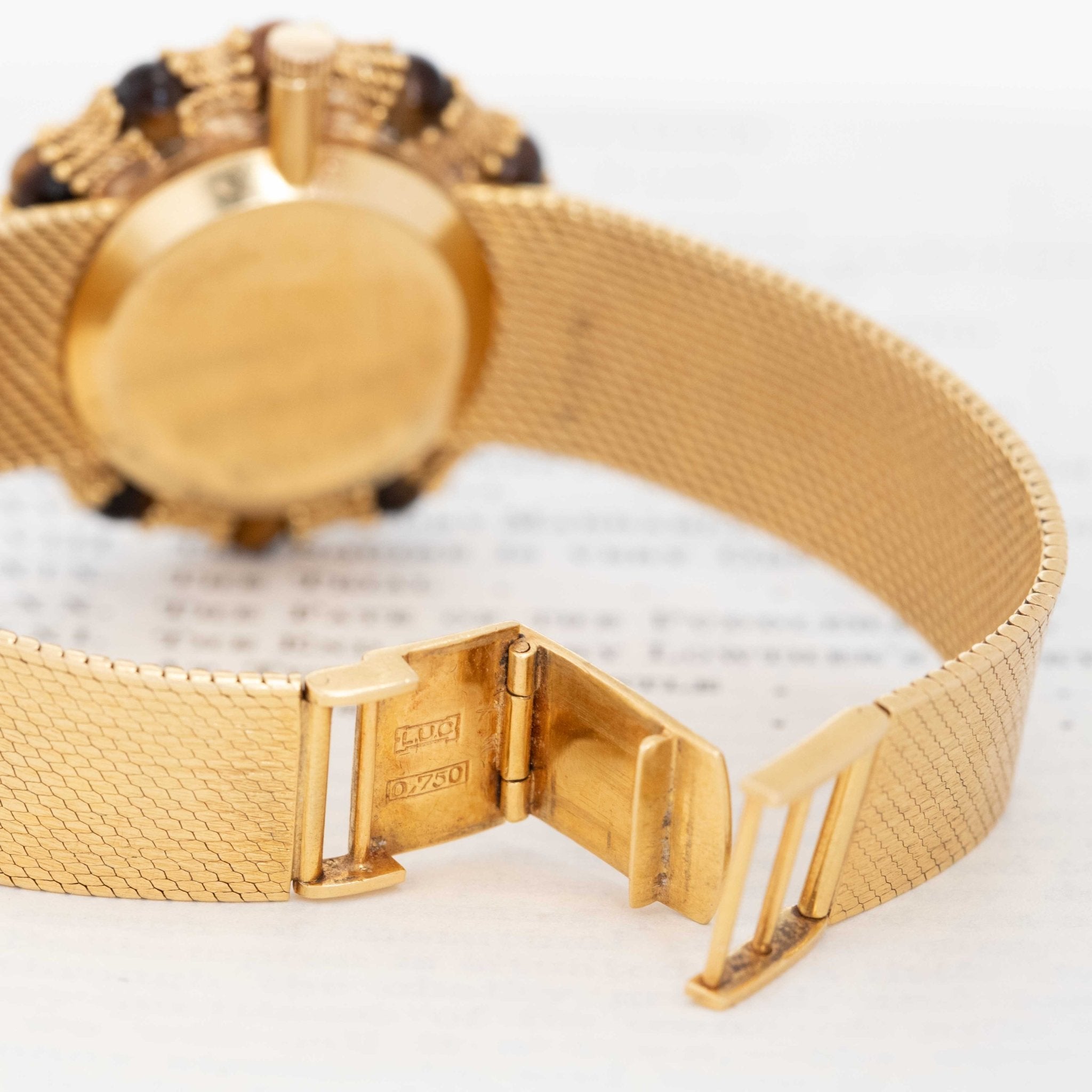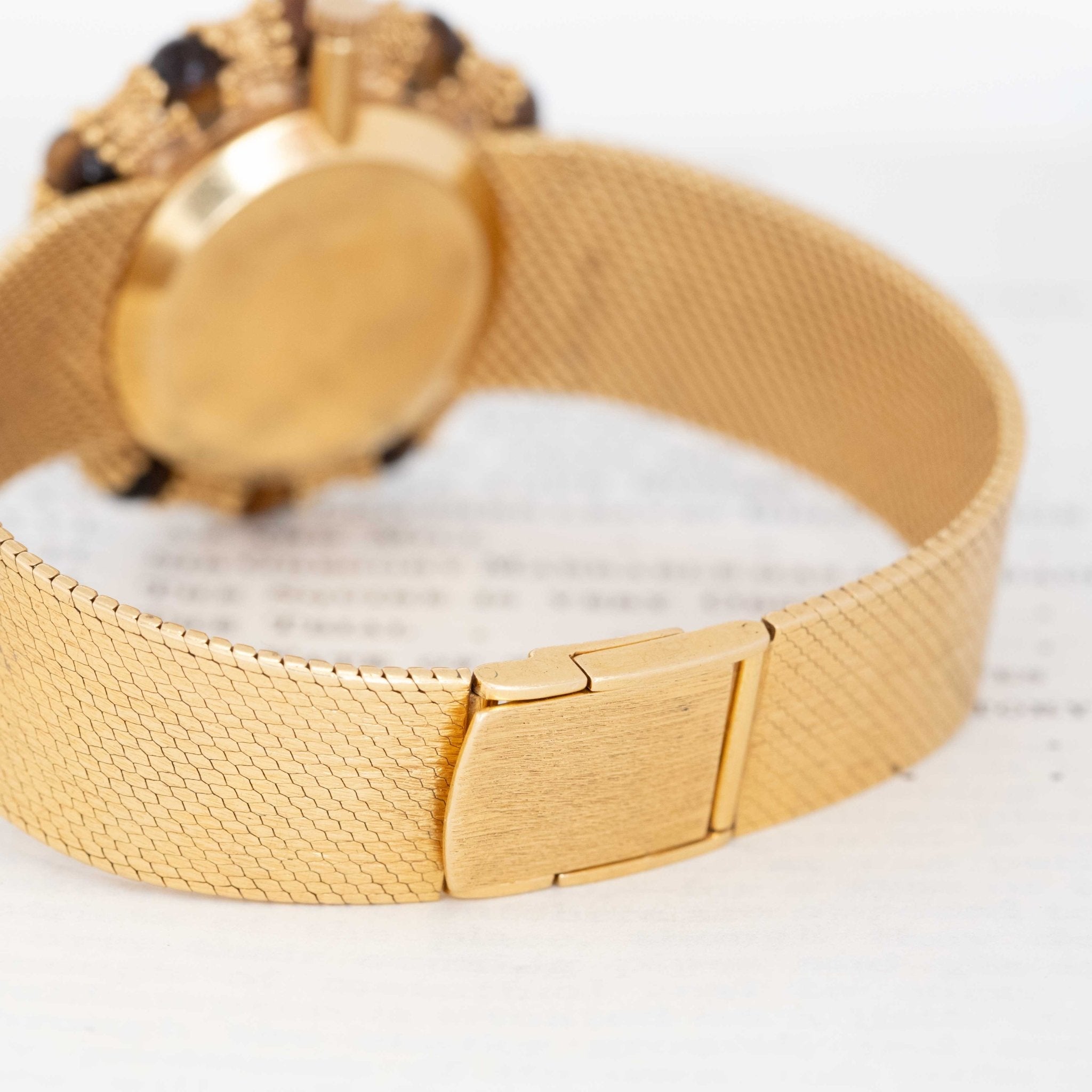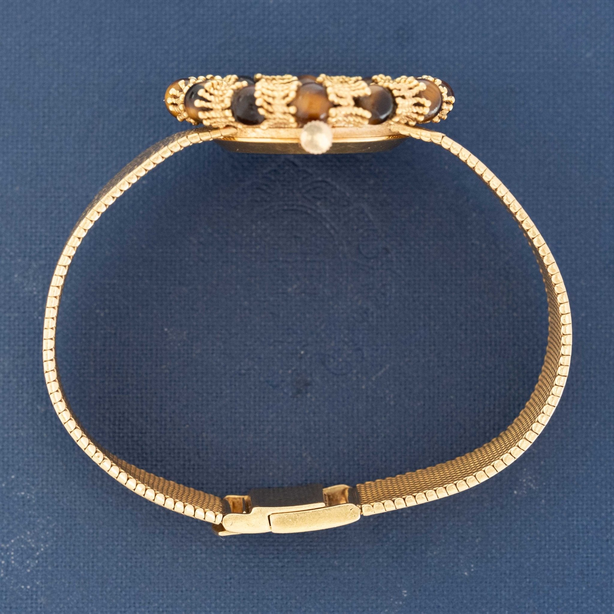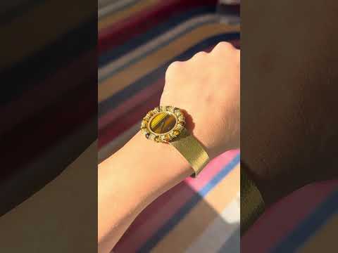 This Chopard watch with yellow gold and Tiger's Eye is a vintage feast for the eyes! A woven gold strap, complete tiger's eye dial and a bezel that combines tiger's eye cabochons with these fluted gold components which, when set together, give the appearance of a bamboo motif. The different shades of brown up against the yellow gold is absolutely to die for, and we're quite taken by its' bold presence.