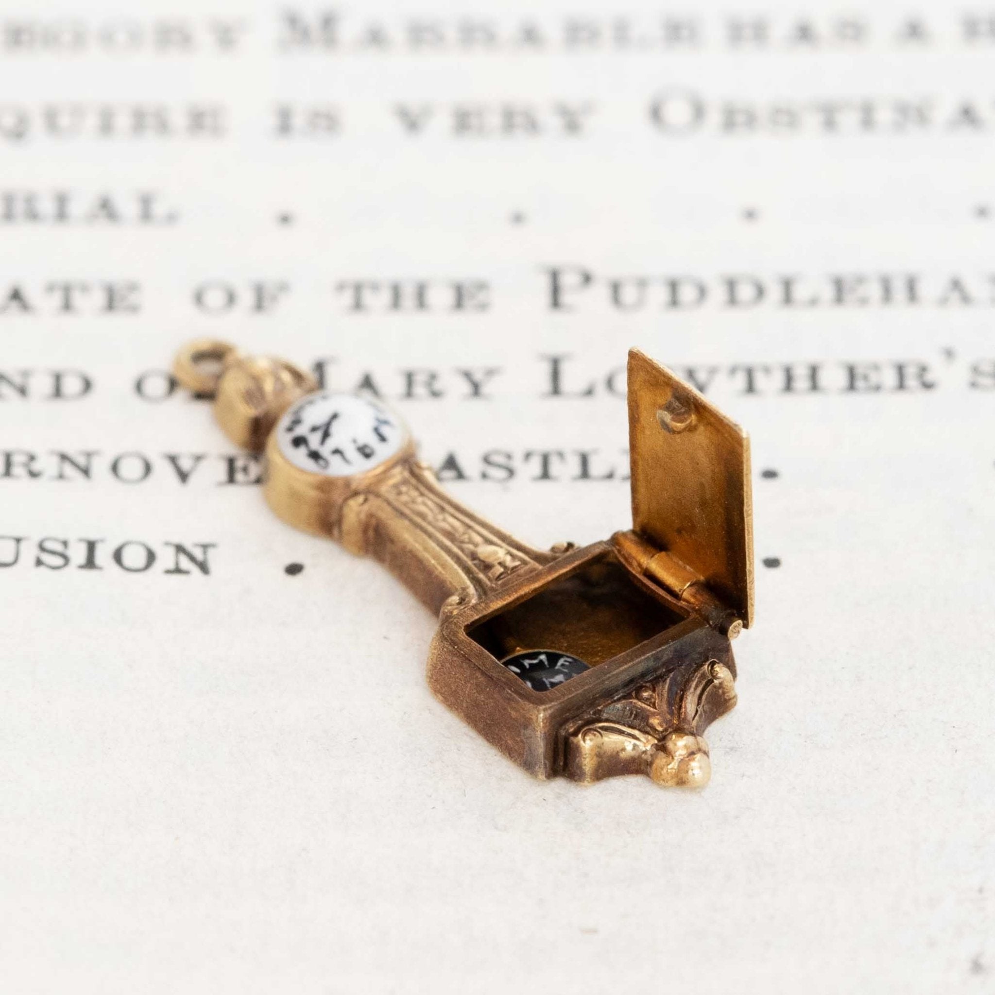 The sweetest vintage clock with a hinged and engraved bottom - when you open it up, it reveals a swingy little mechanism that reads "Time on my hands."