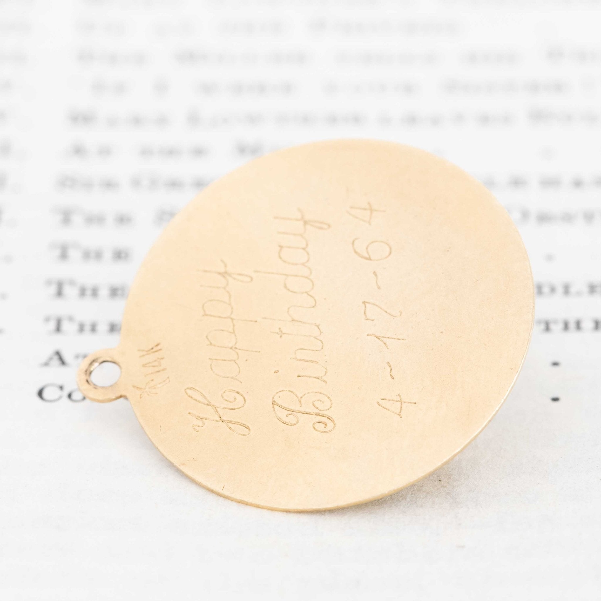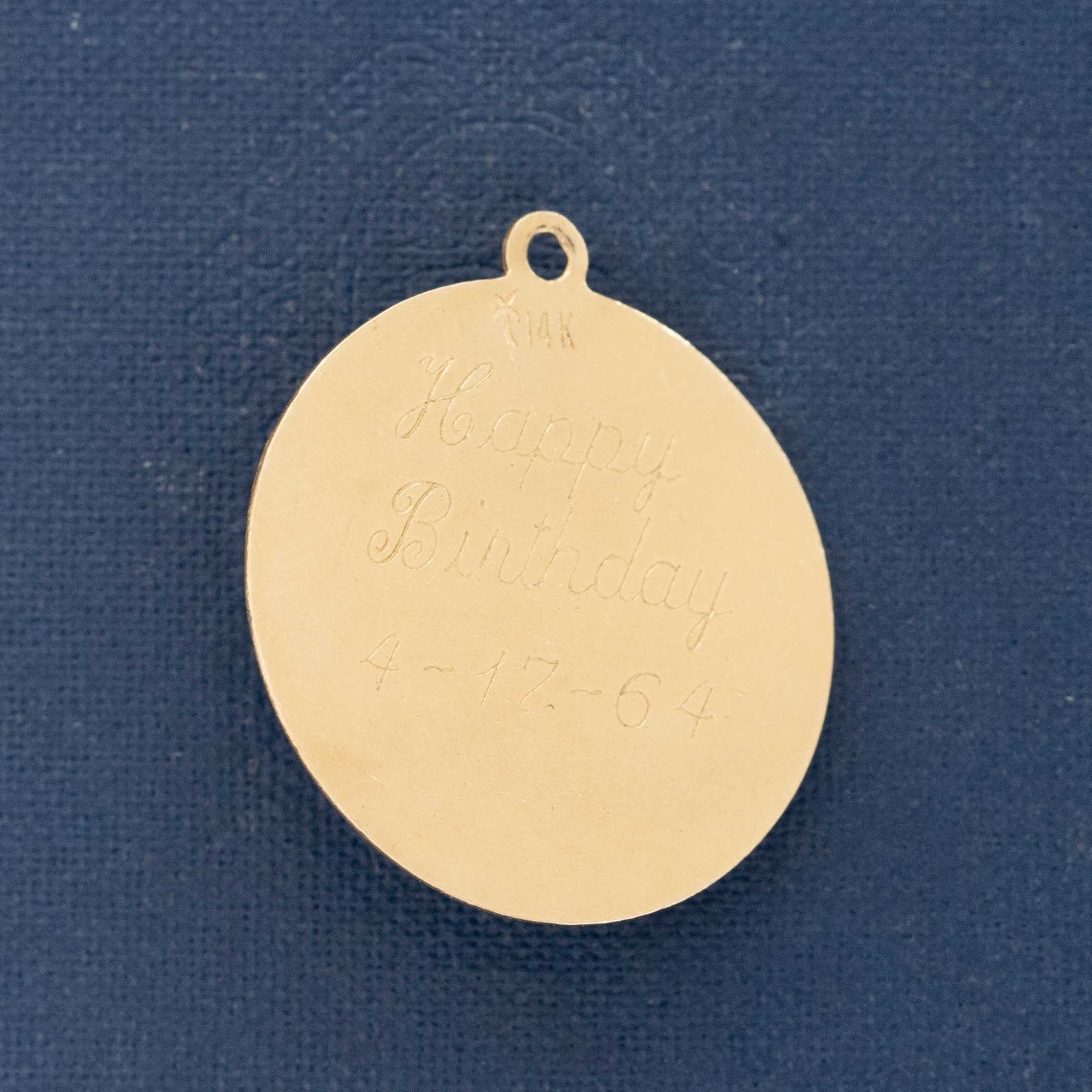 A classic, midcentury medallion charm with a green stone Buddha in the center, and the phrase “Touch Me For Luck” across the gold bezel. I’ve seen plenty of iterations of this medallion, most often celebrating holidays, so this “touch me” good luck talisman was a sweet find!