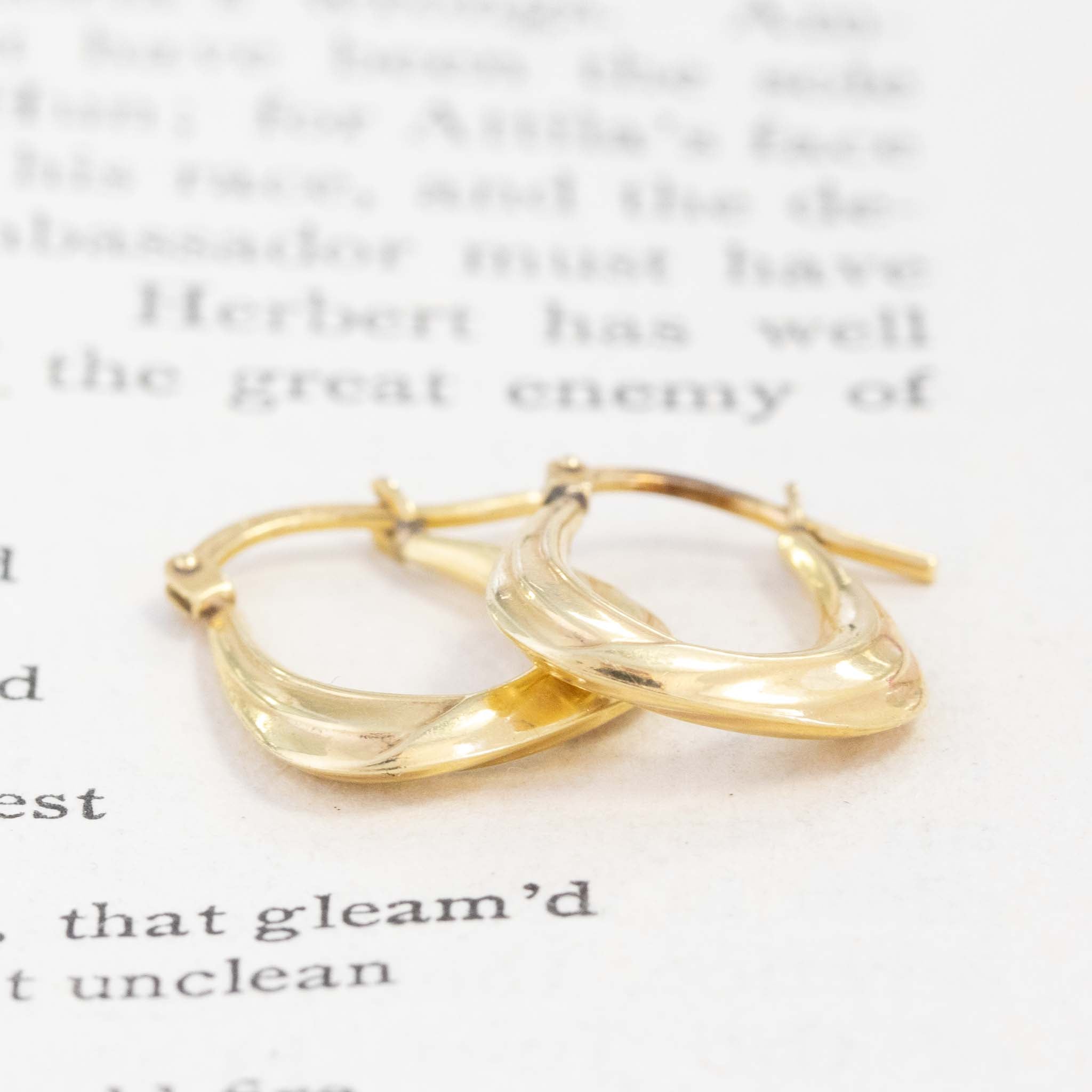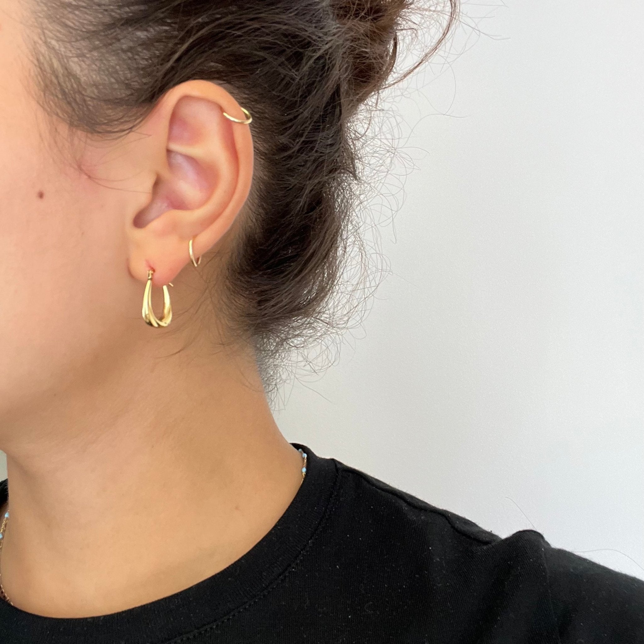 Gold hoops are the perfect everyday accessory, and a staple in one’s jewelry collection. Big or small, thin or chunky, we find that we can simply never have enough! This pair reminds us of the chunky door-knocker earrings of the 80s and 90s, but on a much more petite scale! Super wearable and comfortable on the ear, with just a touch more detail than your average circular hoop earring.