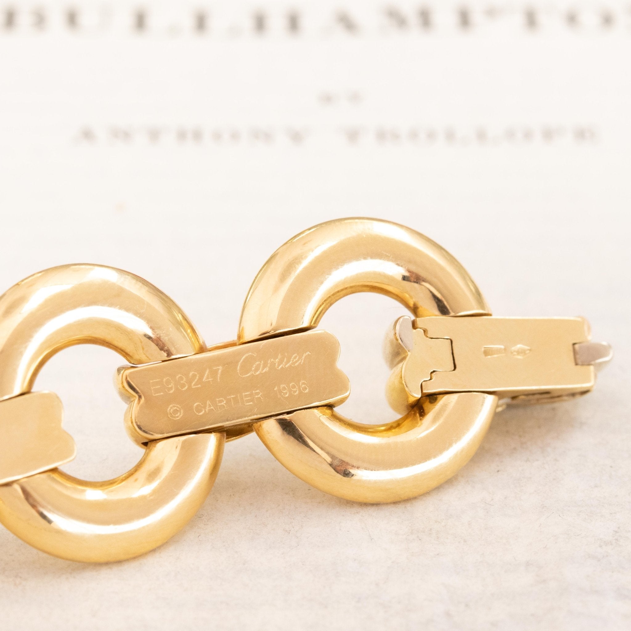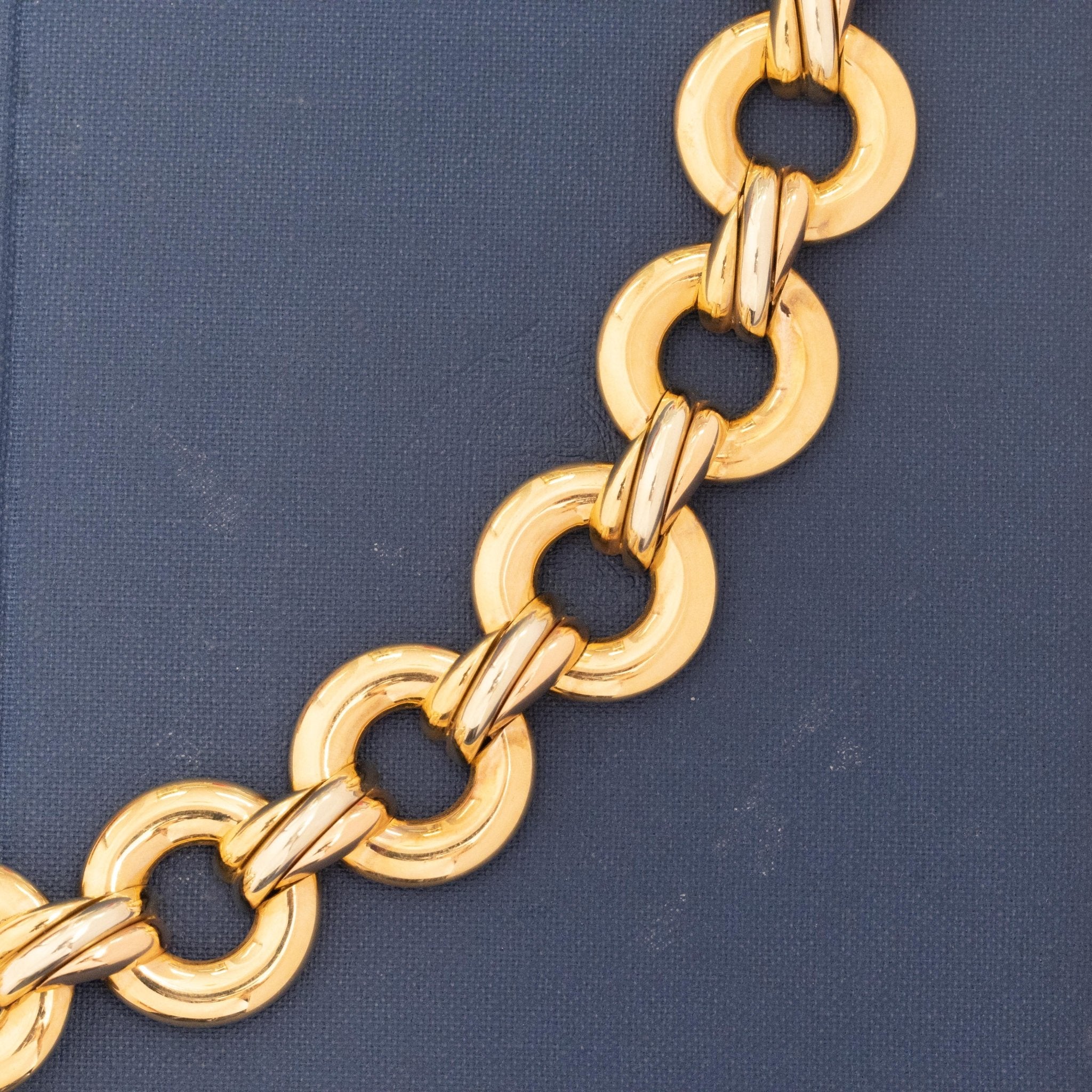 A delicious Cartier trinity necklace straight outta the 90's! Specifically 1996, the year this baby comes to us from. Bold gold rings sit side-by-side along the decolletage, joined together by trinity components that the jewelry house become synonymous with. We love how this necklace sits - bold yet airy with such a beautiful presence. As chic with your favorite going-out dress as it is with a button up blouse.