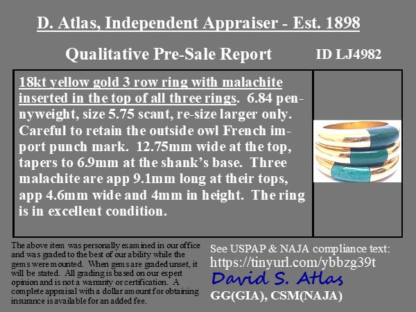 There is nothing quite like the color contrast between yellow gold and green malachite! This French origin vintage ring is a triple stack of gold bands, each with an in-set section of malachite, all three of which vary in color/tone. A delicious chunky ring with beautifully gradient malachite.