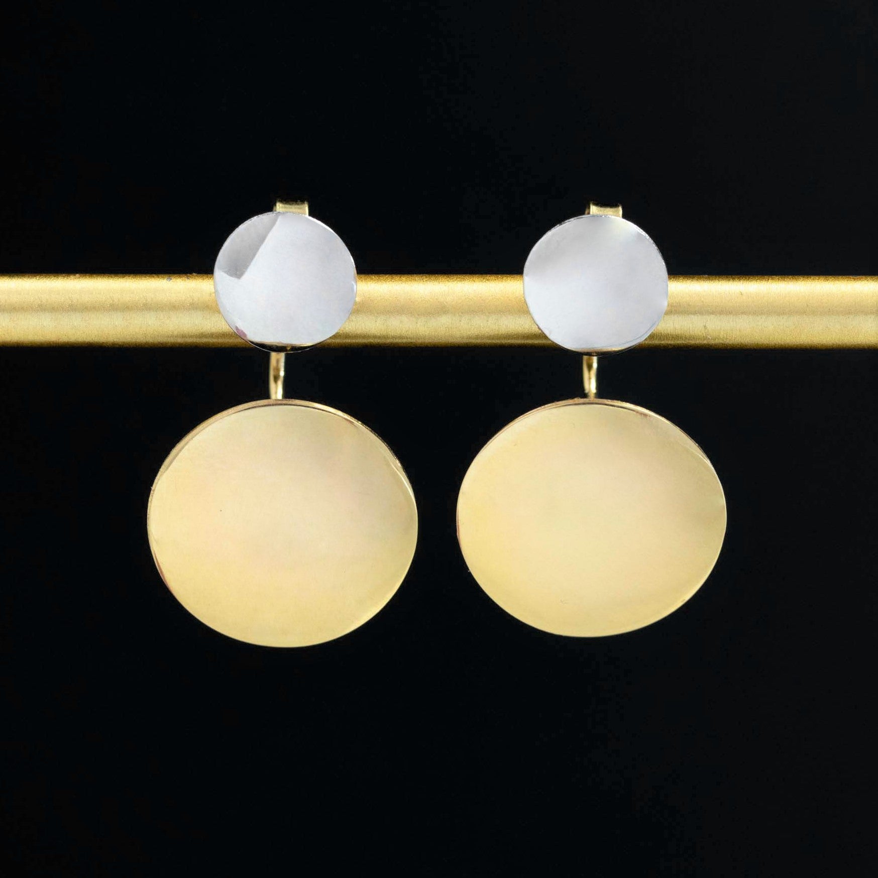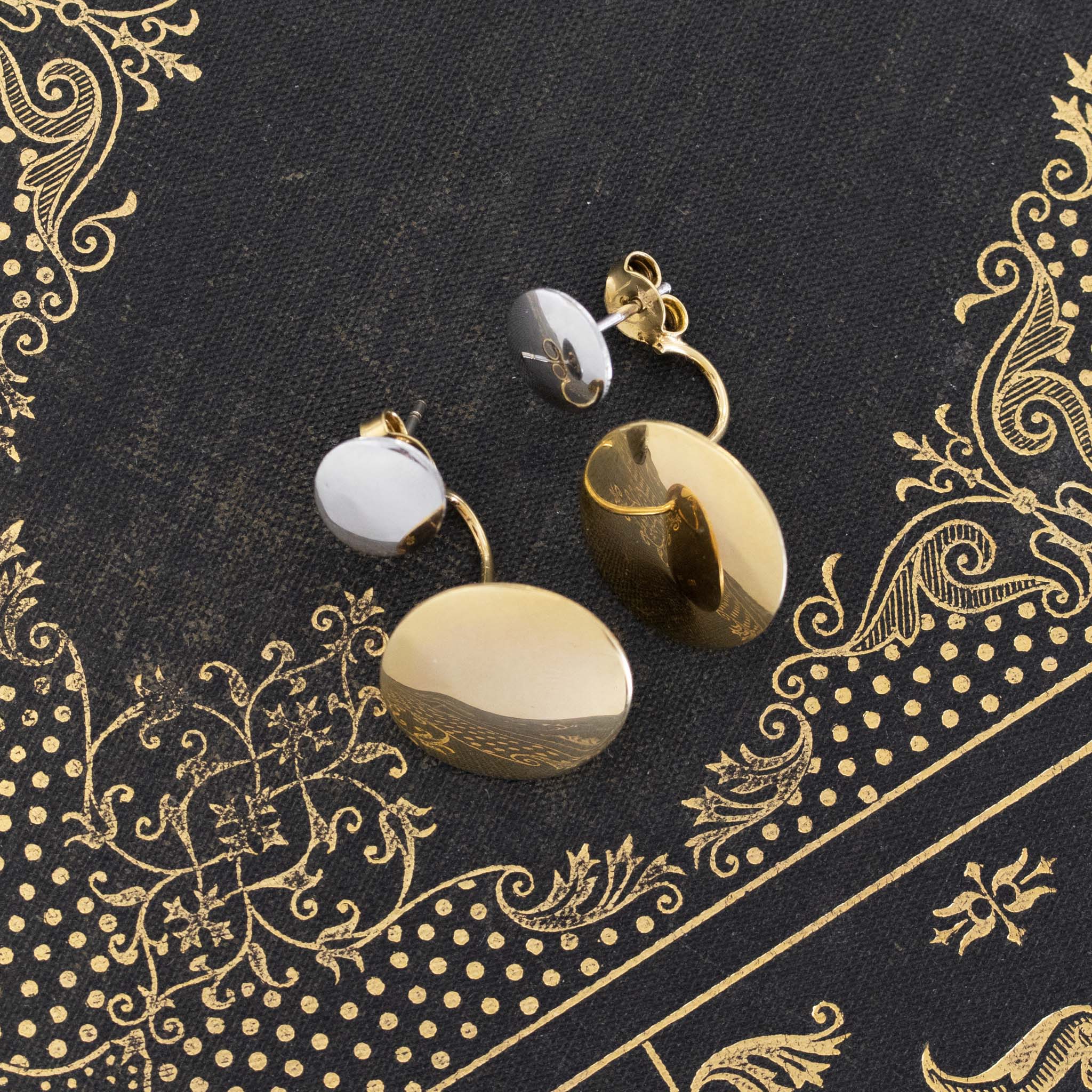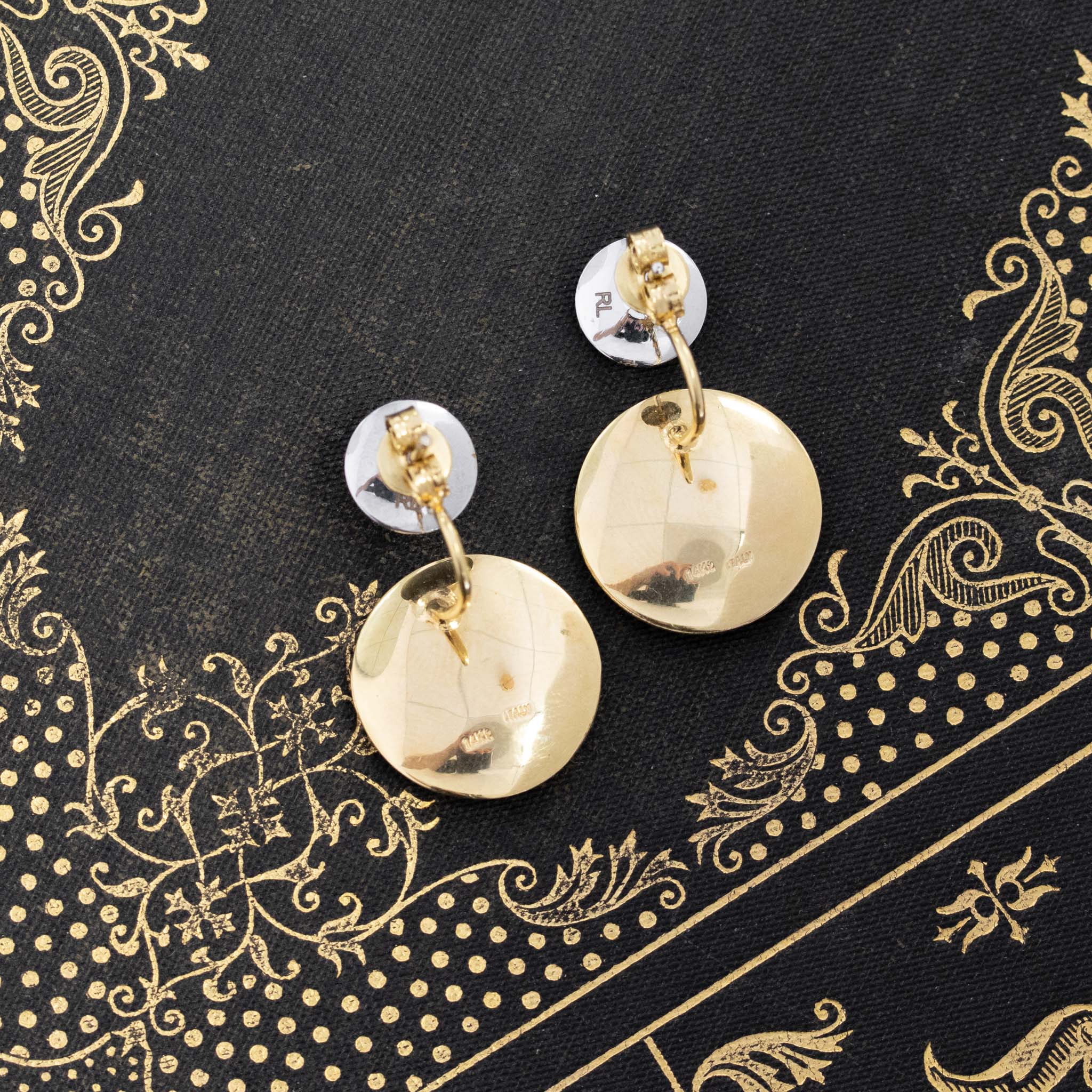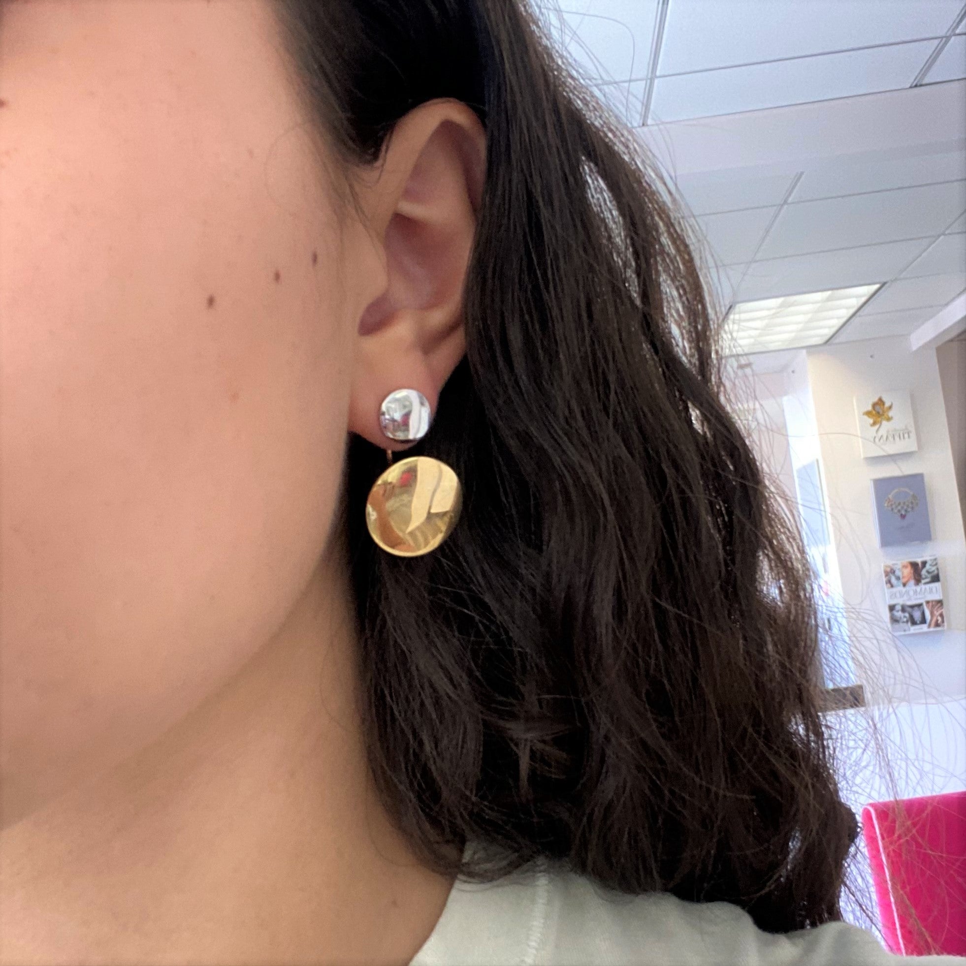 Super chic vintage disc earrings by Ralph Lauren Italy! The closure latches at the back of the top post so the golden bottom disc appears to simply be floating just underneath the lobes. Mod vibes!