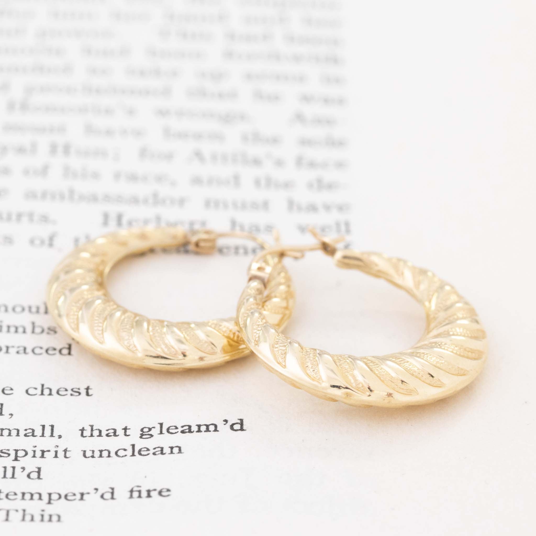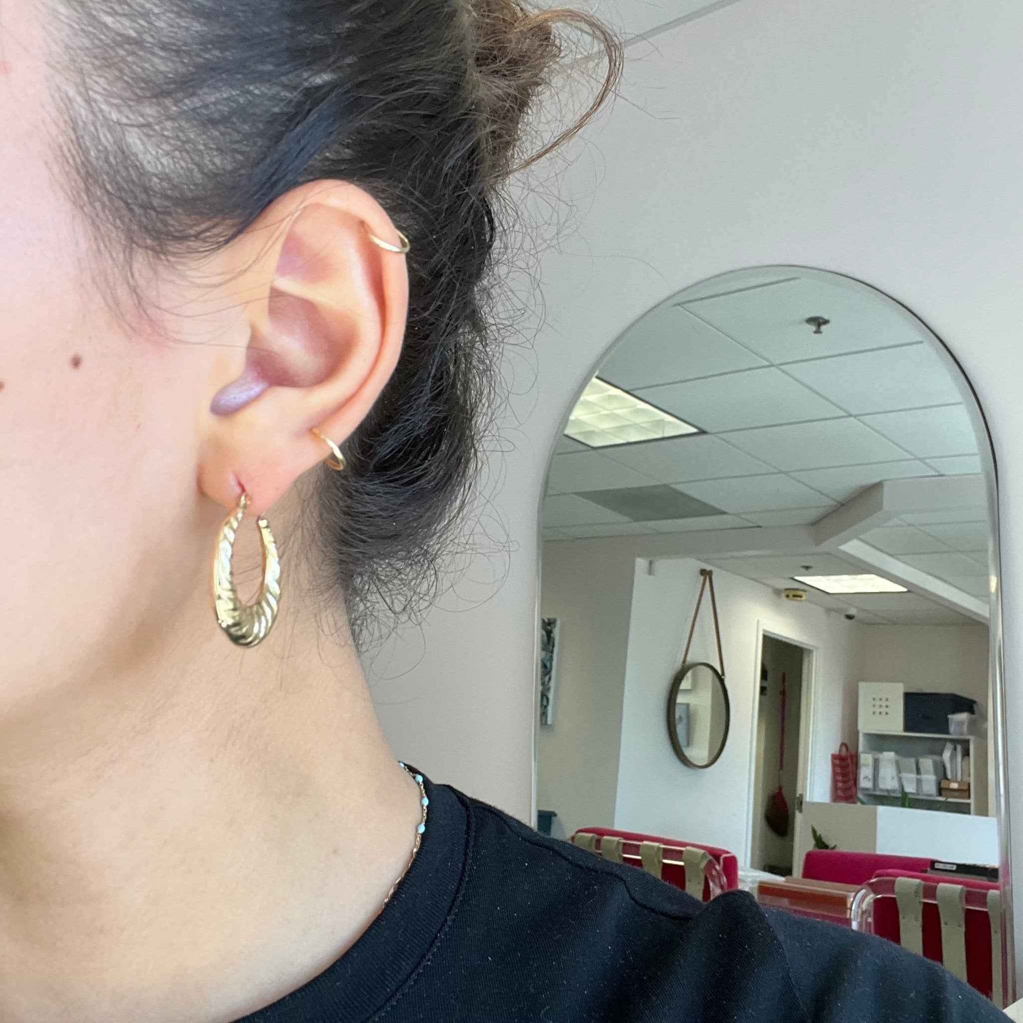 Gold hoops are the perfect everyday accessory, and a staple in one’s jewelry collection. Big or small, thin or chunky, we find that we can simply never have enough! This pair reminds us of the door knocker earrings of the 80s/90s, but on a much more petite scale! Not to mention comfortable on the lobes, as they are hollow. With a smooth fluted pattern and slightly graduated form, these are perfect for daily wear.