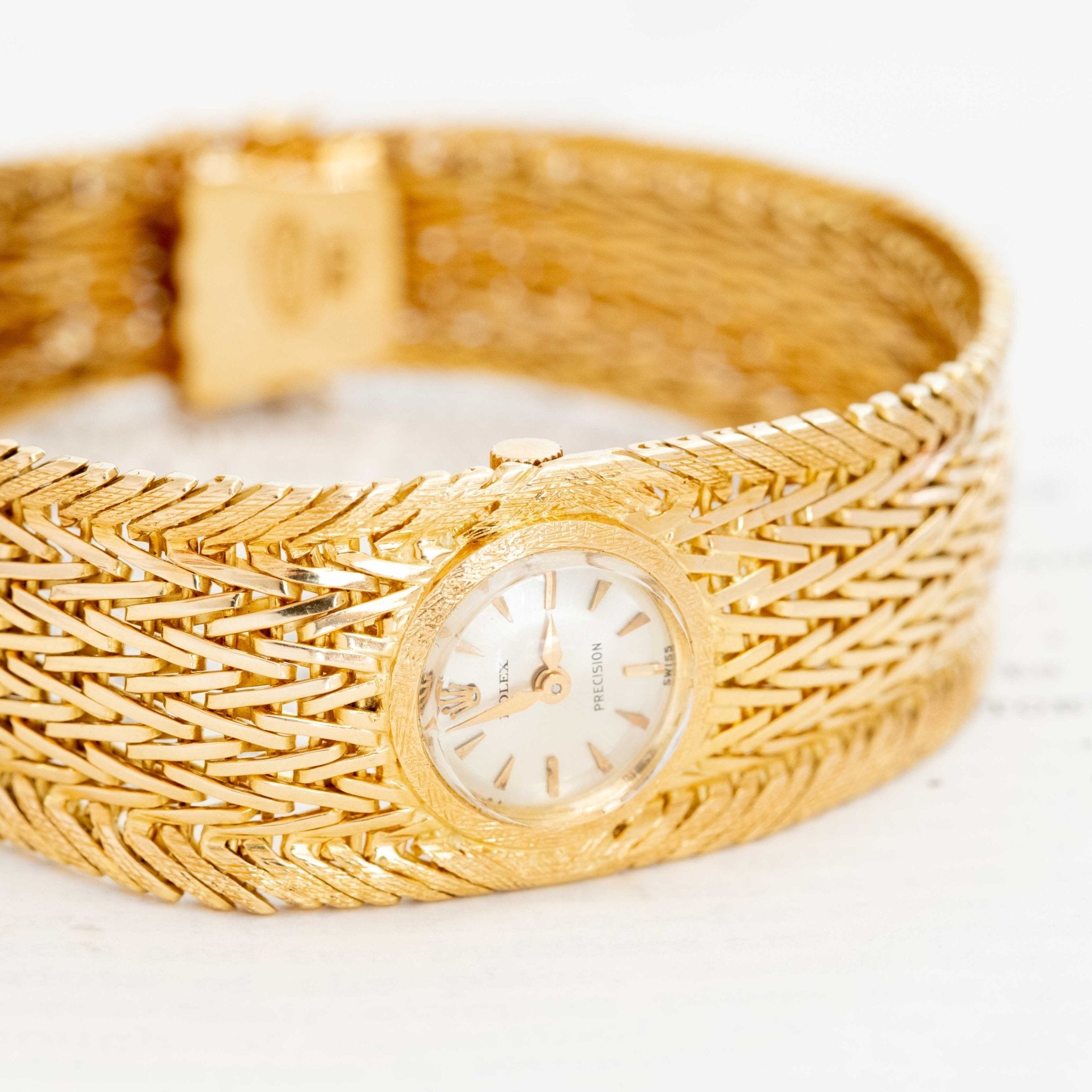 Part timepiece, part vintage gold bracelet! Another vintage lady's Rolex watch, this time in a much more bold + gold iteration. The dial is flush set onto a woven, wide gold bracelet with incredibly craftsmanship. We love how this piece feels like both a watch and a piece of jewelry - functional adornment, if you ask us.