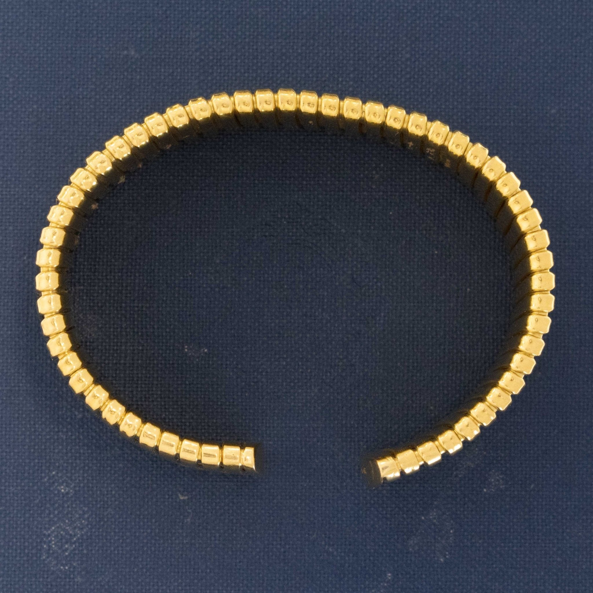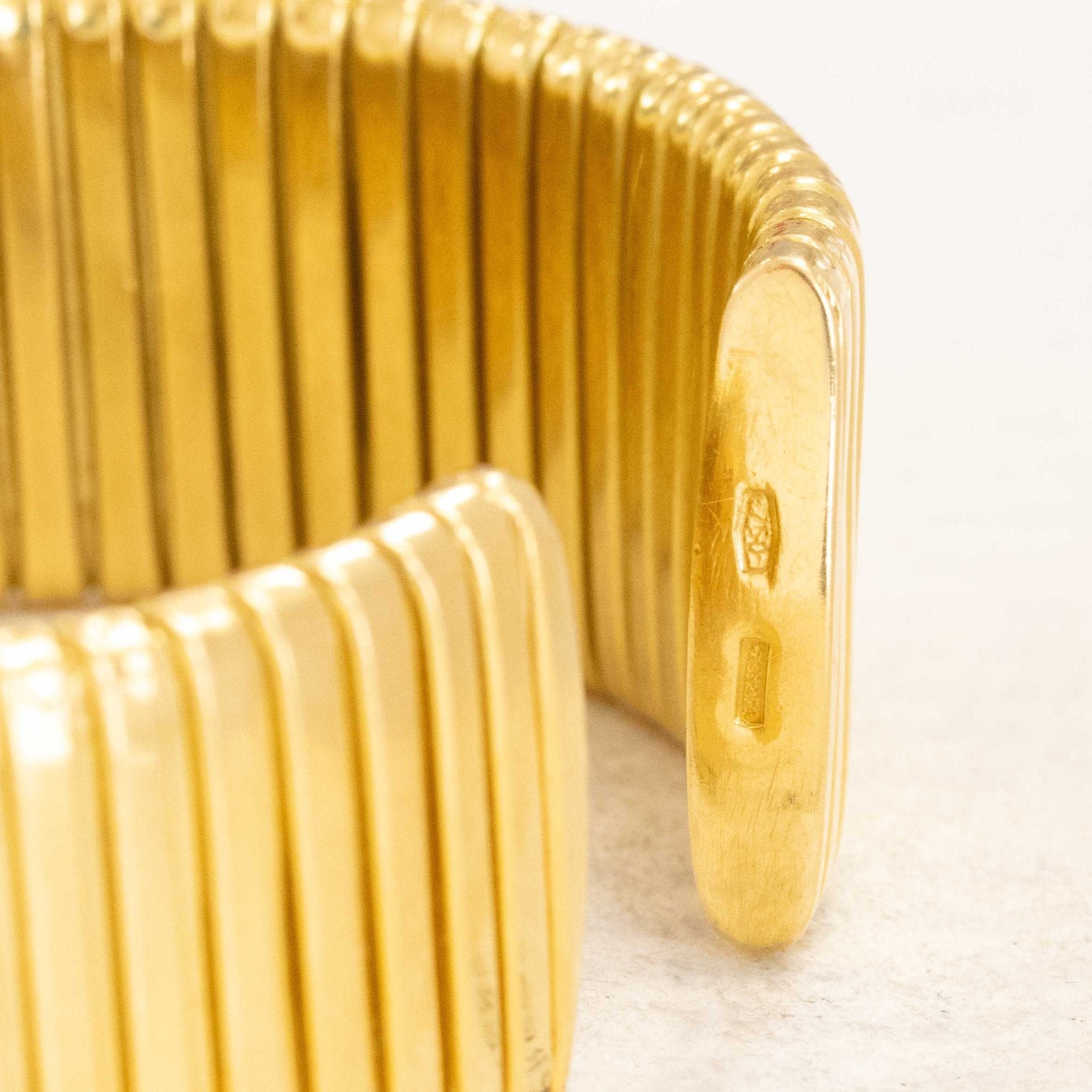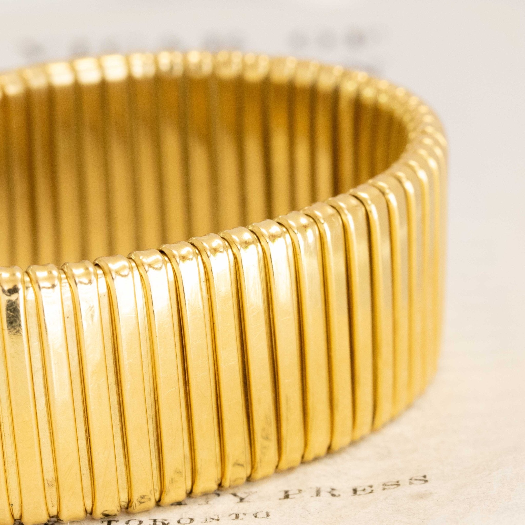 Step back into the swinging '70s with this bold and timeless vintage wide gold tubogas cuff. Crafted in yellow gold, this statement piece wraps your wrist in retro vibes with its iconic, flexible tubular design. Whether you're dressing up for cocktails or adding a dash of glam to your everyday look, this cuff is just effortless cool in the most luxurious way possible. And the heft of it - just so luscious.