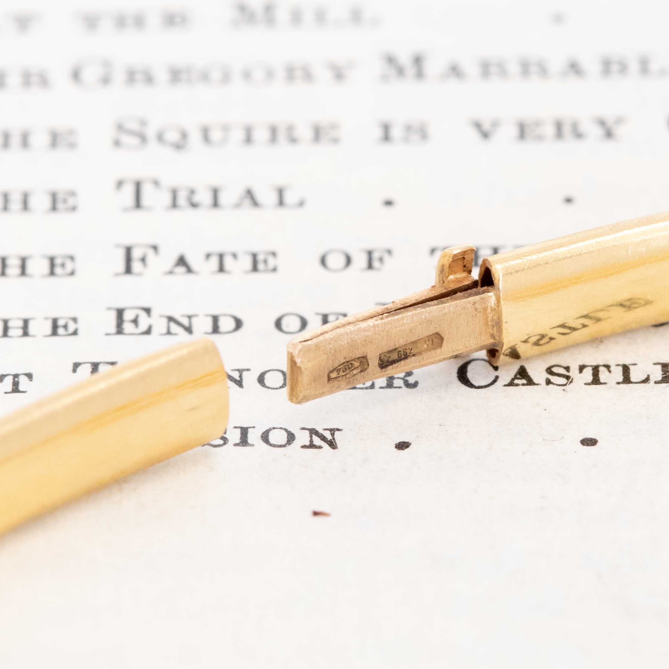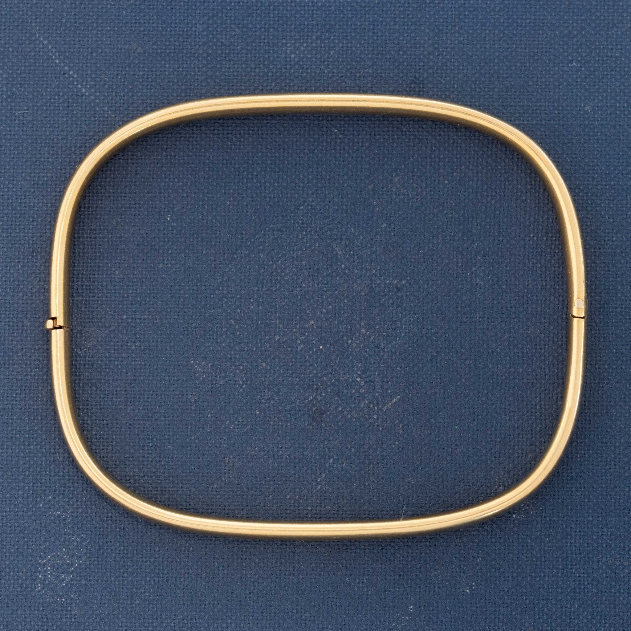 A hinged, square-shaped bangle in 18kt yellow gold. Hollow in make, it offers a bolder look at a better value, and can we talk about this shape? I love the bit of geometric form that it adds to a wrist stack.